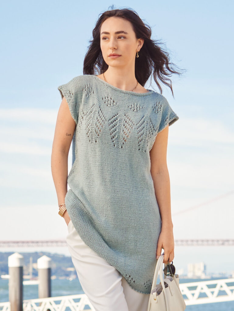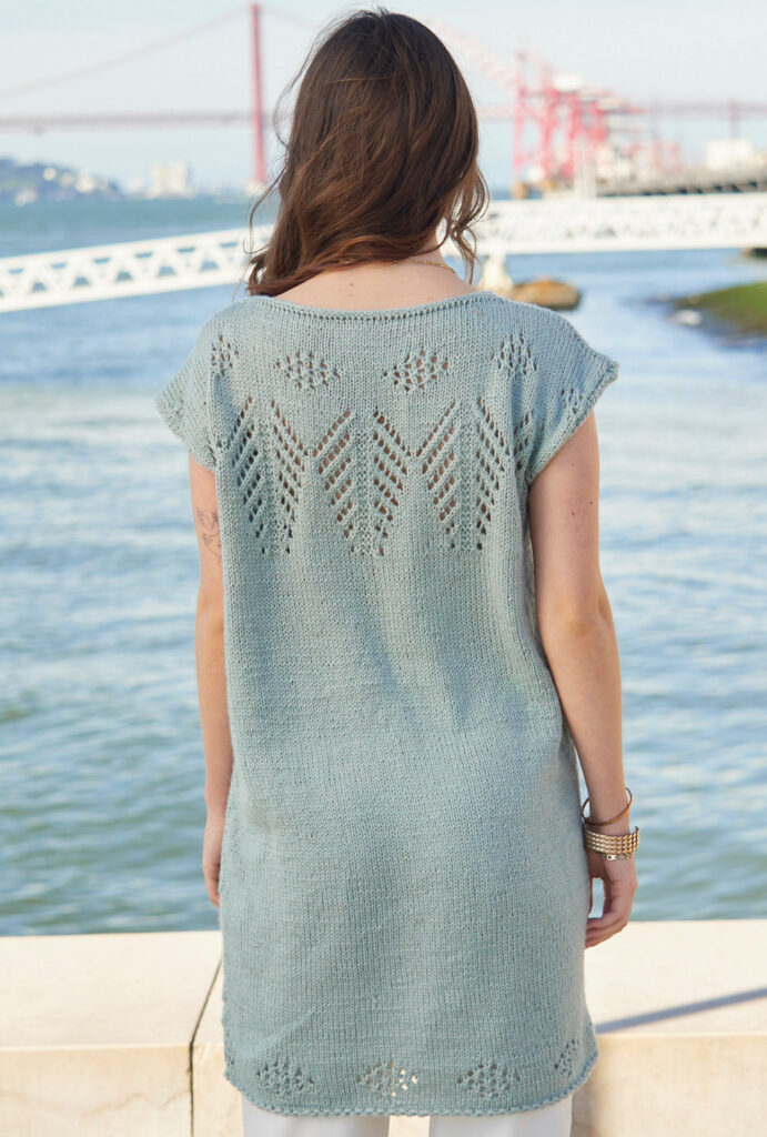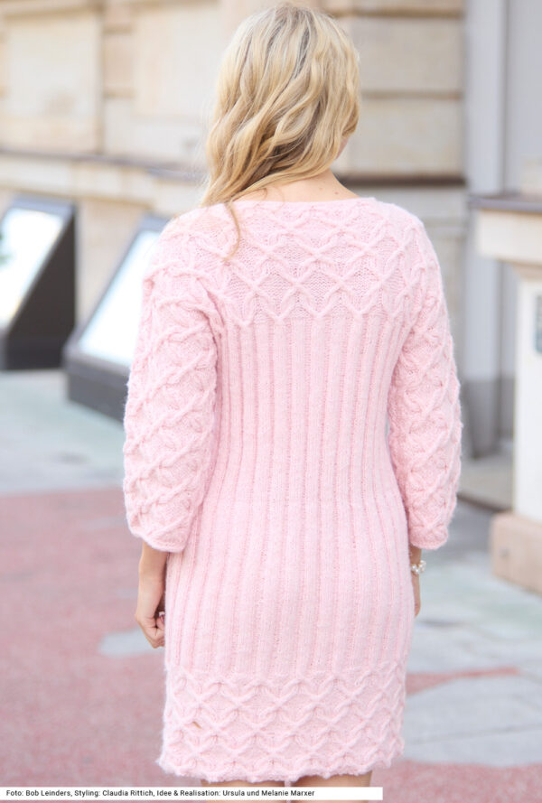 Das mintfarbene Kleid mit überschnittenen Ärmeln wird größtenteils glatt rechts gestrickt, sodass du rasch vorankommst. Über den ganzen Brustbereich gibt es ein großzügiges aus zweierlei Ajourmustern bestehendes Muster und am Saumrand ist ein zartes Ajourmuster eingearbeitet, das sehr dezent ausfällt. Sowohl der U-Boot-Ausschnitt als auch die Armausschnitte bekommt zum Schluss noch einen I-Cord-Rand – wie der gearbeitet wird, steht in der Anleitung. Als Garn haben wir ein Polyacryl-Schurwolle-Mischgarn gewählt. Die Anleitung steht in den Größen 38/40, 44/46 und 50/52 zur Verfügung.