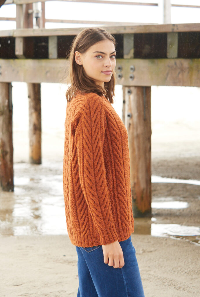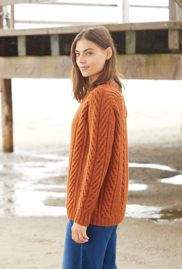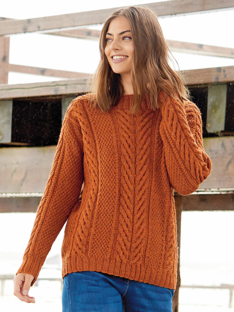 Der kürbisfarbene Pulli aus Schurwolle mit Alpaka-Anteil lebt vom Wechselspiel zwischen Perlmuster und Zopfstreifen. An den Ärmeln verläuft nur in der Mitte der breite Doppelzopf, flankiert von einem schmalen Zöpfchen rechts und links. Diese Zopfkombi läuft über die Schultern weiter als sogenannte Sattelschulter. Ansonsten ist der Schnitt recht einfach und ganz gerade, die Ärmel nehmen der Bequemlichkeit halber nach oben hin an Weite zu. Für Bündchen und Ausschnittblende werden 2/2-Rippen gestrickt. Die Anleitung ist für die Damengröße 38/40, 42/44, 46/48 und 50/52 sowie die Herrengröße 44/46, 48/50, 52/54 und 56/58.