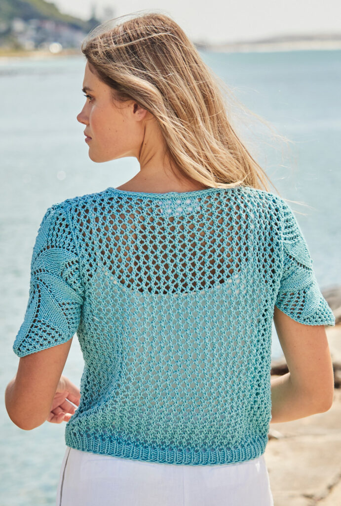 Der türkisfarbene Sommerpulli aus Baumwolle mit recycelter Polyesterfaser ist im einfachen Netzmuster mit 5er-Nadeln gestrickt. Besonderheit sind jedoch die beiden sternförmigen Blüten, die als ungewöhnliche Ärmellösung in die Armausschnitte genäht werden. Die Ärmel sind mit einem Nadelspiel rundgestrickt und werden in der Blütenmitte begonnen, Vorder- und Rückenteil werden ganz gerade in zwei Teilen gearbeitet. Der Rippenbund beginnt mit dem doppelfädigen Kreuzanschlag. Der V-Ausschnitt ist mit einem Kordelrand, dem sogenannten I-Cord, umstrickt. Eine Anleitung steht in den Größen 36/38, 40/42 und 44/46 zum Download bereit.