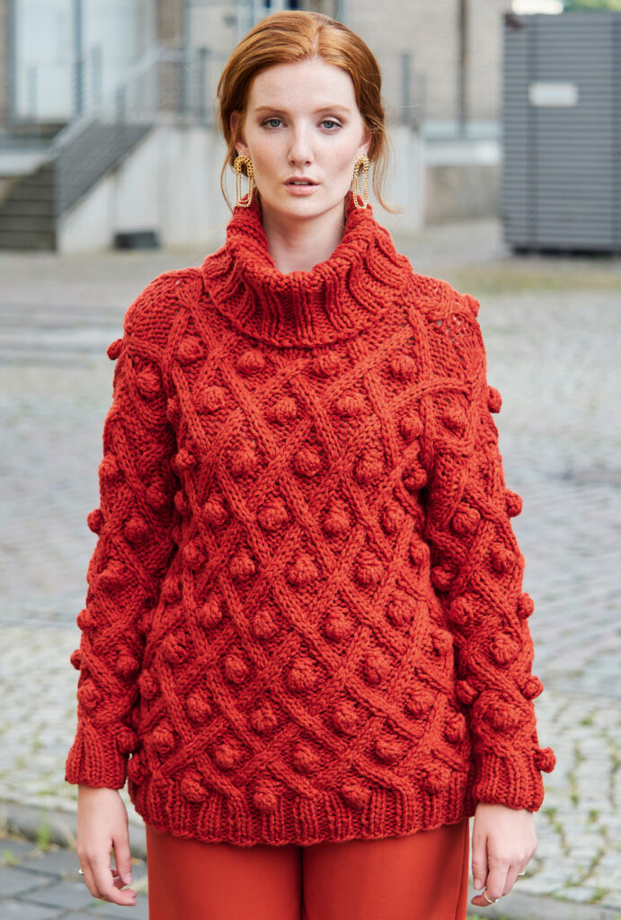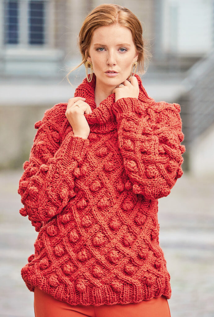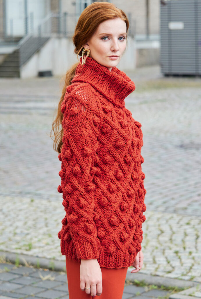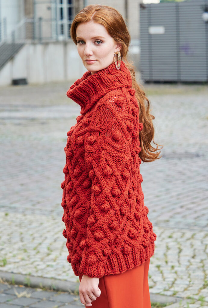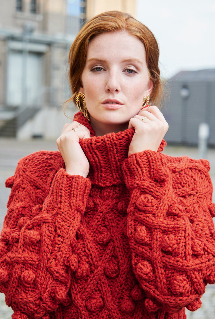 Comeback für Noppen: Bei diesem topmodischen Rolli werden sie in ein Rautengeflecht integriert – sieht stark aus und macht Eindruck! Noppen und verkreuzte Maschen sind sehr typisch für Island und auf den Aran-Inseln – in diesem Design wird gekonnt gezeigt, wie dynamisch und kraftvoll modern die Traditionsmaschen daherkommen können. Das Muster benötigt Anfangs schon Konzentration, aber die übersichtliche und klare Strickschrift in der Anleitung hilft dabei, den Überblick zu bewahren – schnell wirst du feststellen, dass Noppen zu stricken süchtig machen kann! Gestrickt wird in einzelnen Teilen von unten nach oben. Sind alle vier Teile fertig gestrickt, werden noch alle Nähte geschlossen und aus dem Halsausschnitt der Rollkragen im Rippenmuster herausgestrickt.