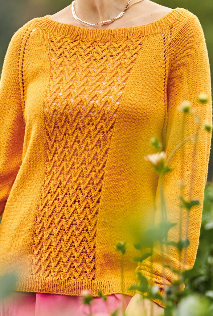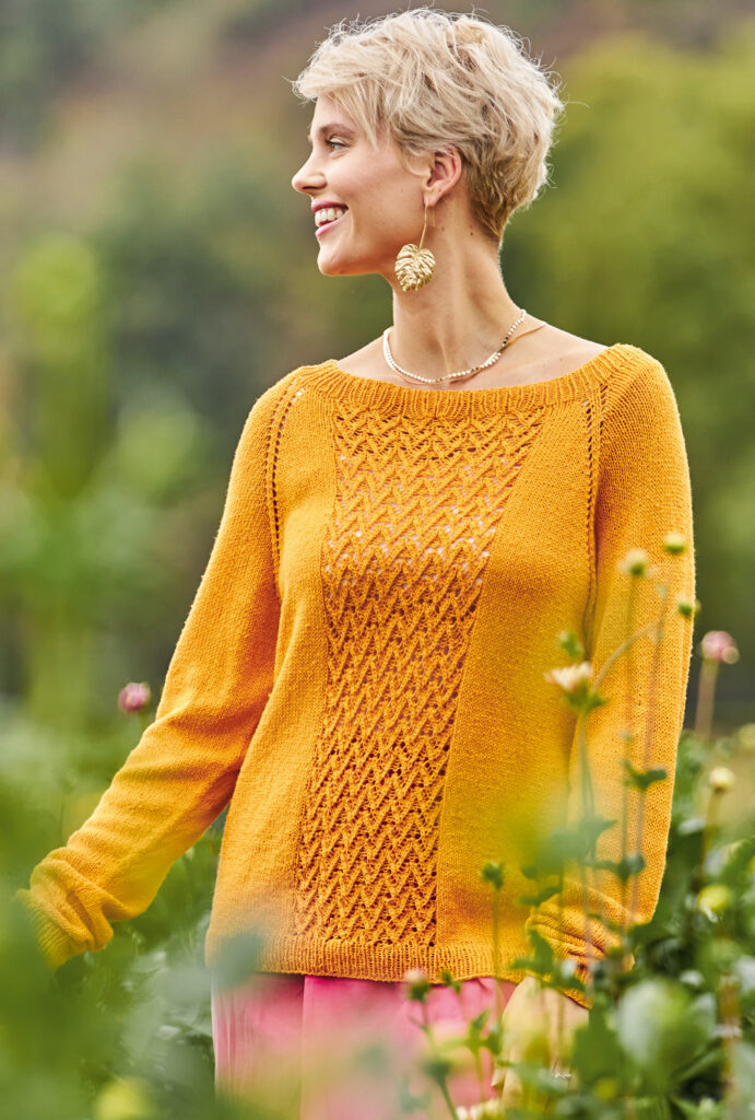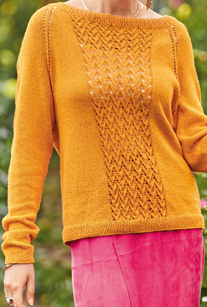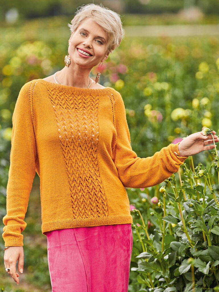 Dieser dekorative sonnenfarbene Strickpulli für laue Sommerabende wird «Raglan von oben», also an einem Stück von Halsausschnitt abwärts gestrickt: Somit entfällt das lästige Zusammennähen der Einzelteile am Ende der Strickarbeit. Gestrickt wird mit einem Garn aus 100 % Seide glatt rechts, im Rippenmuster und, für den dekorativen Streifen in der Mitte von Vorder- und Rückteil, im Ajourmuster. Die ausführliche Strickanleitung für die Größen 36/38, 40/42 und 44/46 inklusive Schnittzeichnung und Strickschrift erleichtert das Nachstricken auch für etwas ungeübtere Strickerinnen.