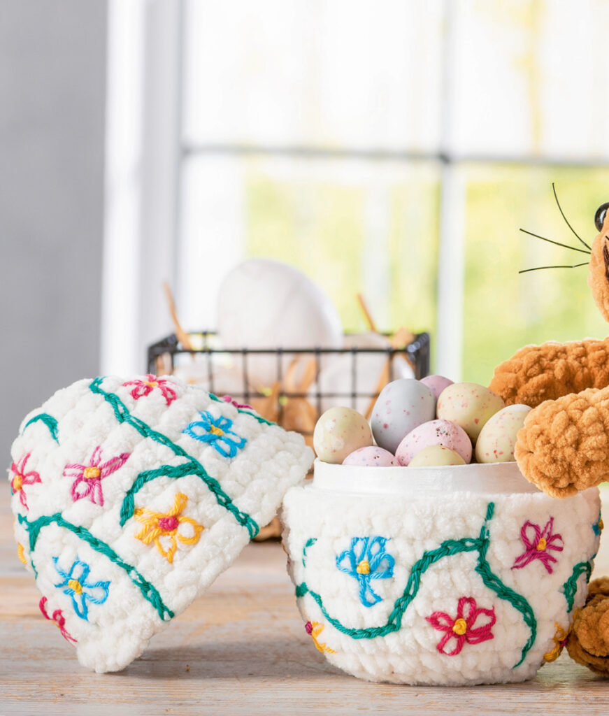 Mit Kettenstichen werden die Ei-Hälften nach dem Häkeln noch mit hübschen Ranken bestickt. Aus je 5 Margeritenstichen und 1 Knötchenstich dann noch ein paar bunte Blüten zwischen die Ranken sticken.