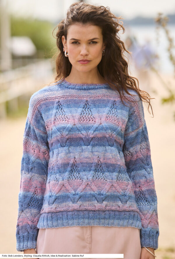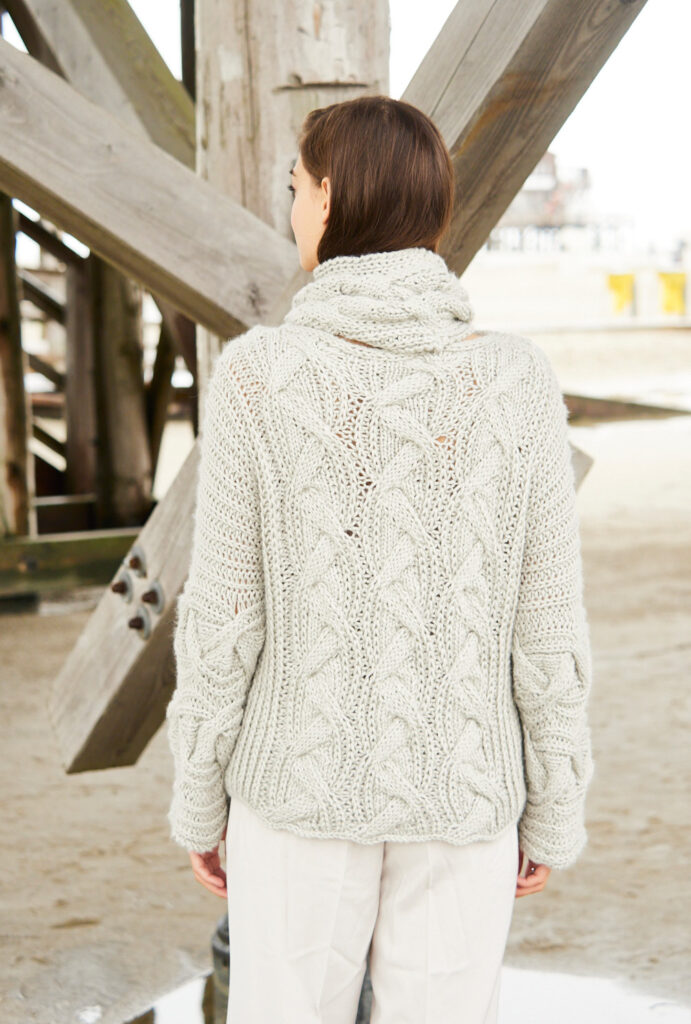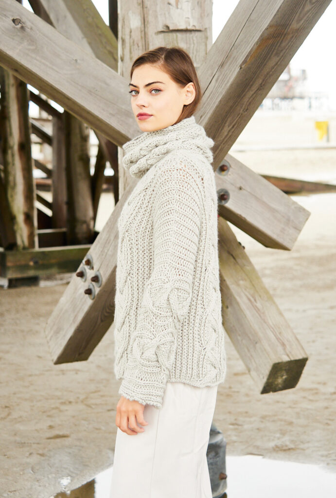 Der voluminöse, an einem Stück über die Schulter hinweg gearbeitete Pullover beeindruckt mit seinem kraftvollen, breiten Zopfmuster, das dem Modell eine prägnante Struktur verleiht. Zwischen den Zöpfen kommt das Patentmuster zum Einsatz, das sich auch innerhalb der Zöpfe wiederfindet. Der runde Halsausschnitt hat einen I-Cord-Rand, den man unter dem Loop im gleichen Muster wie der Pulli jedoch auf den ersten Blick nicht erkennt. Die Anleitung für ein aschgraues Garn aus Polyacryl und Alpaka kann für die Größen 36/38, 40/42 und 44/46 und für den Loop, der 30 cm in der Höhe und 52 cm rundum misst, downgeloadet werden.