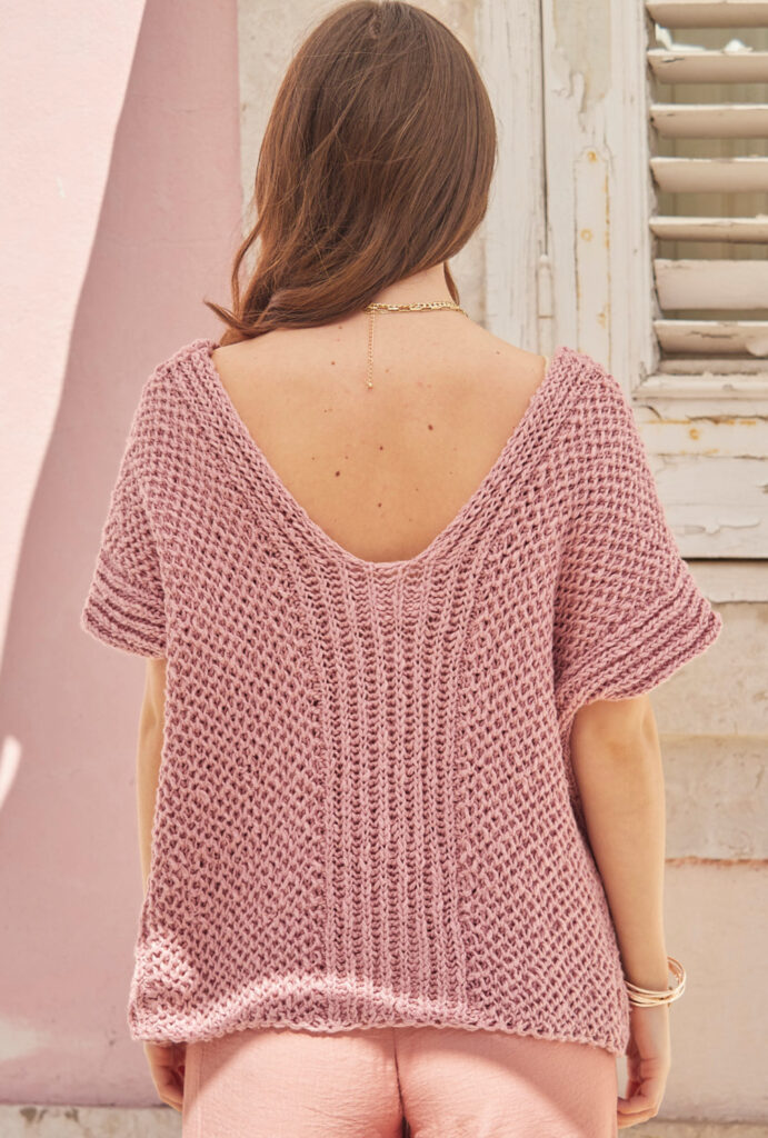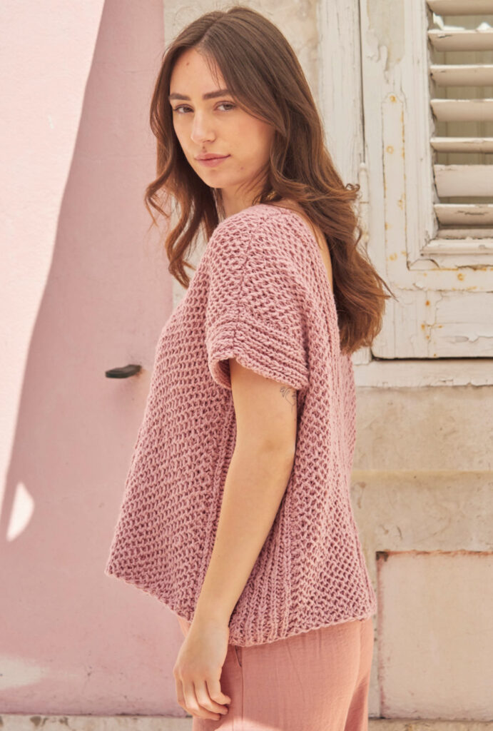 Zwar ist der Schnitt dieses Oversize-Pullis bzw. -pullunders sehr simpel, da nur zwei Rechtecke zu arbeiten sind, jedoch erfordert das Netzpatentmuster und auch das Vollpatentmuster etwas mehr Zeit. Der Halsausschnitt ist vorne und hinten gleich, was dem Look eine moderne Note verleiht. Am Ende müssen nur noch die Schulter- und die Seitennähte geschlossen werden, denn auf Bündchen und Blenden kann völlig verzichtet werden. Zum modischen Understatement gehört auch das vornehme Garn aus einer Baumwolle-Seide-Mischung in antikem Rosé. Die Anleitung dazu gibt es in den Größen 38 – 44 und 46 – 52.