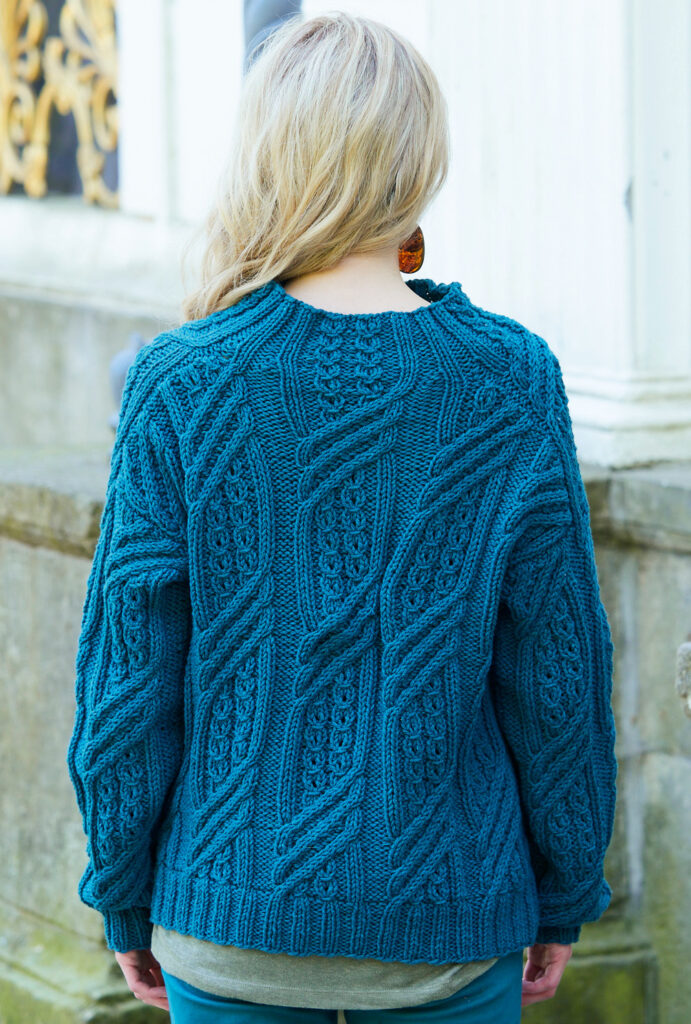 Man muss Geduld aufbringen, um diesen lässigen Zopfpulli zu stricken, jedoch werden sich Strickenthusiasten darüber freuen. Und der Aufwand lohnt sich, denn das Ergebnis ist einzigartig und individuell. Gestrickt aus schadstofffreier Schurwolle überzeugt der Oversize-Pulli auch noch in der nächsten Saison. Schwungvolle Linien mit eingebetteten kleinen Zöpfen wechseln sich ab mit glatt linken Streifen. Die Ärmel enden in einer Schuterpasse, deren Muster zusammen mit den Vorder- und Rückenteil-Maschen am Kragen fortgesetzt wird. Saum- und Ärmelbündchen sind in 2/2-Rippen gearbeitet. Eine Anleitung ist für Größe 38/40 vorhanden.