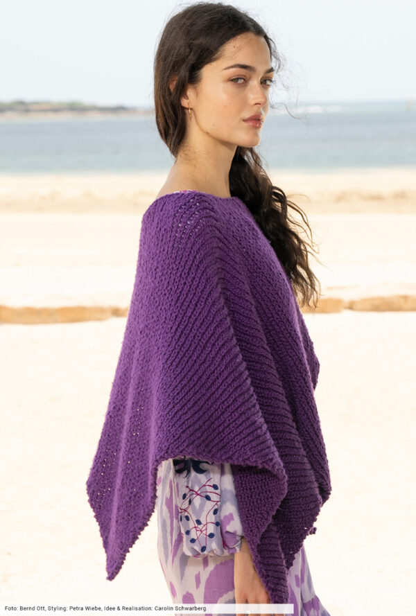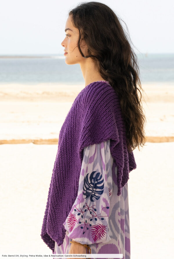 Aufsehenerregend ist dieser Poncho. Am Ausschnitt begonnen, wird er in immer größer werdenden Runden gehäkelt. Das Muster besteht aus Luftmaschen, festen Maschen, Stäbchen und überwiegend Doppelstäbchen. Für die Zunahmen werden an vier Stellen die Maschenmarkierer gesetzt. Sie werden am besten in jeder Runde mitgeführt. So weiß man immer genau, wo die Zunahmen gearbeitet werden. Ab der 14. Runde beginnt die Formgebung, damit der Poncho nicht zu weit wird. Es ist aber einfach, wenn du genau nach Anleitung und der zusätzlichen Häkelschrift arbeiten. Sollte dir der Poncho zu lang werden, kannst du ihn natürlich früher beenden. Wichtig ist nur, dass zum Schluss die 19. Runde als schöner Abschluss gehäkelt wird. Du benötigst eine Häkelnadel Nr 4. Das schöne Verlaufsgarn in Blau-Grau Tönen ist von Langendorf & Keller. Und der Poncho deckt die Größen 36, 38, 40, 42, 44 und 46 ab.