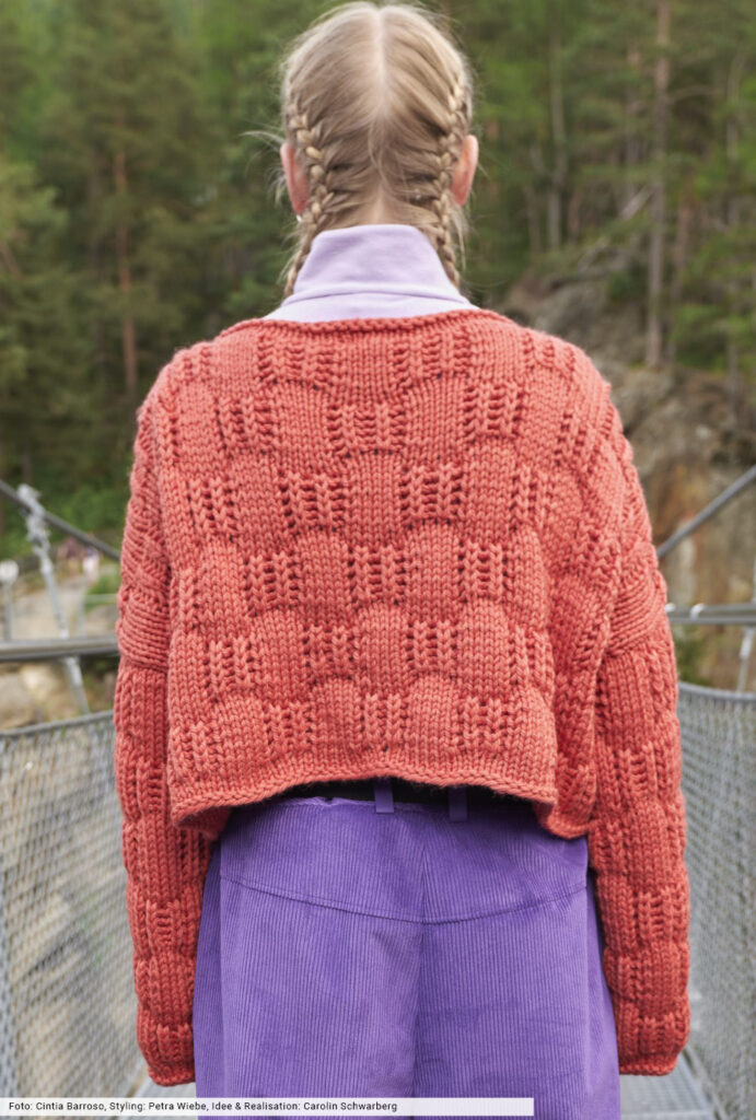 Voller Power präsentiert sich dieser tomatenrote Kurzpulli, dessen plakatives Karomuster durch das griffige Wollgarn zusätzlich akzentuiert wird und fast dreidimensional zur Geltiung kommt. Wir haben dafür Reihe für Reihe eine genaue Beschreibung erstellt, bei der sich Glatt-rechts-Maschen mit Patentrippen abwechseln. Ein toller Effekt, an den sich auch Anfängerinnen wagen können. Das Finish bilden schmale Blenden, bei denen lediglich eine Rückr rechte Maschen zum Einsatz kommt.