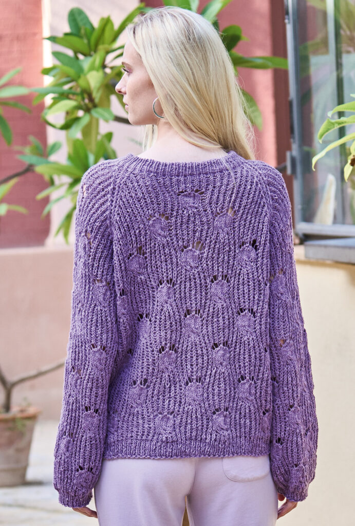 Wer sich mit Patentmustern nicht auskennt, sollte hier zur Übung eine Maschenprobe anfertigen und sich dabei nach unserer Strickschrift A stricken, weil hier die Technik in Reihen angegeben wird. Danach kann’s losgehen: Erst mit den Bündchen aus rechten und linken Maschen beginnen, dann die Arbeit mit den Rippenstrukturen und den Lochmotiven fortsetzen. Danach alle Teile zusammenfügen und die Raglanpasse in Runden nach der Strickschrift B stricken, dabei auch gleich die Halsblende anfügen, die zum Schluss zur Hälfte nach innen gesäumt wird. Und dann natürlich den Pulli tragen und bewundernde Blicke einheimsen.