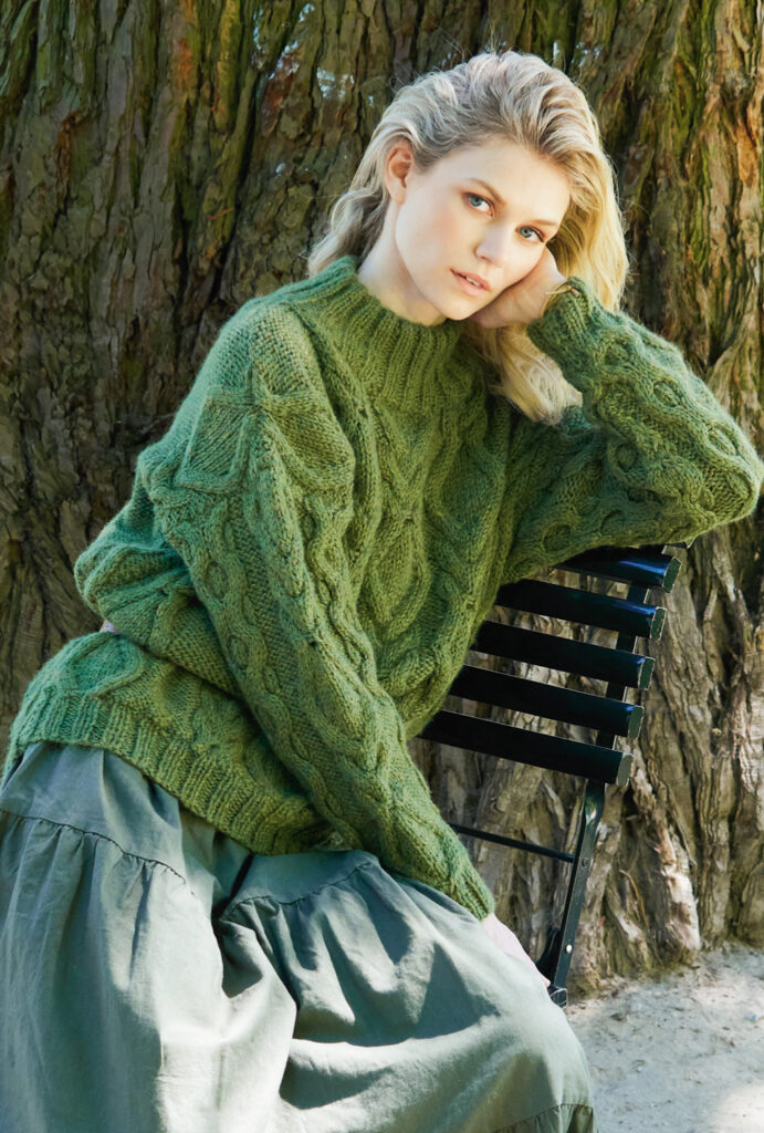 Soft das Garn, stark die Optik: Mit diesem grün melierten Zopfmustermix bist du an kalten Wintertagen warm eingepackt, denn die Lamawolle wärmt angenehm und kratzt nicht. Für alle, die gerne Zöpfe stricken, ist dieses Modell ein wahres Festival: An Vorder- und Rückenteil gehen Rautenzöpfe in Tulpenzöpfe über, an den Ärmeln kommt ein Wabenzopf hinzu. Für den doppelt gelegten Turtelneck-Kragen werden 2/2-Rippen gestrickt, wie auch für die Saum- und Ärmelbündchen. Der Schnitt ist unkompliziert, gerade eingesetzte Ärmel erleichtern das Einnähen. Die Anleitung gibt es für die Größen 38/40 sowie 42/44 und 46/48.