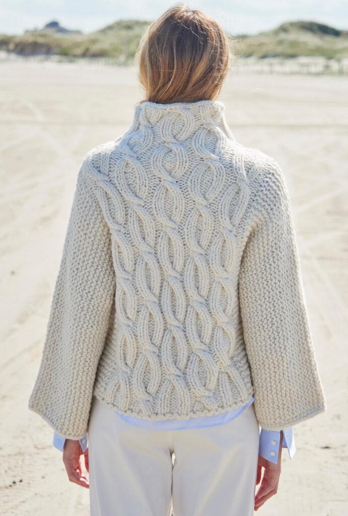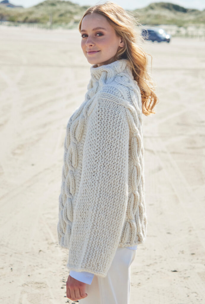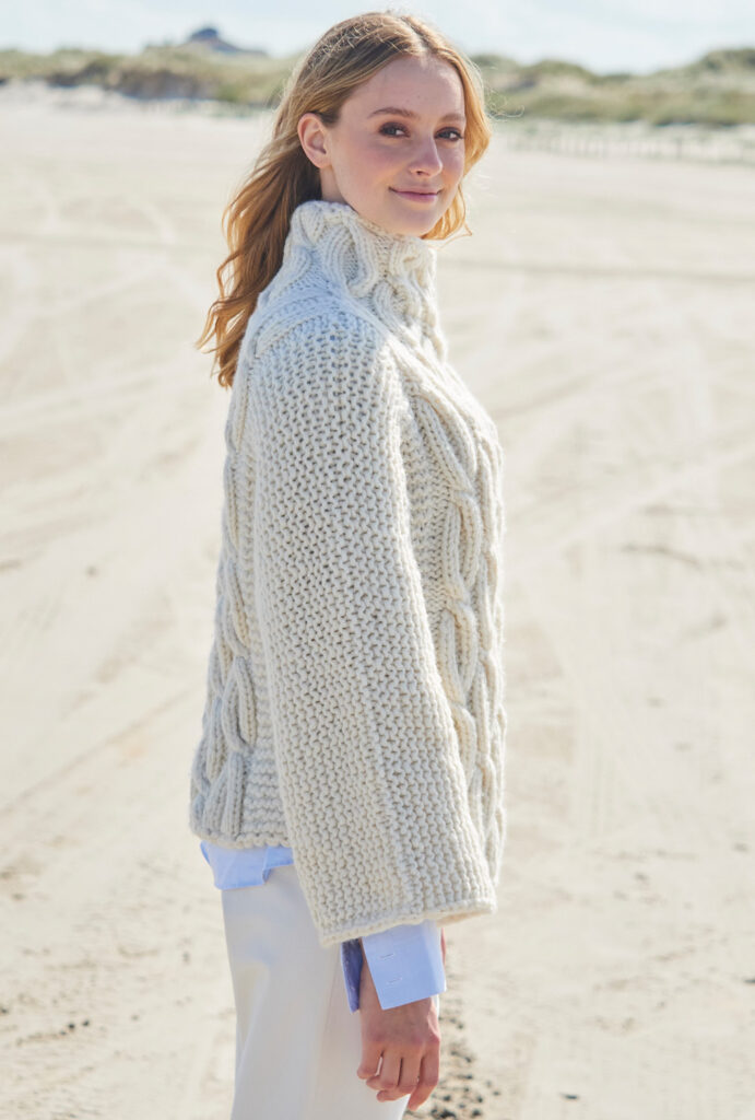 Ein opulentes Zopfmuster in der breiten Mittelpartie streckt optisch und lässt den Körper schmaler wirken. Beidseitig bis über die Ärmel verlaufend sind Kraus-rechts-Rippen, denn gestrickt wird das Ganze in einem Stück über die Schultern hinweg mit dicken Nadeln Nr. 9. Am Stehkragen laufen die Zöpfe weiter; hier kommen Nadeln Nr. 8 zum Einsatz, damit der Kragen nicht zu weit vom Hals absteht. Die Anleitung für diesen warmen Wollpulli in Wollweiß gibt es in den Größen 36/38 und 40/42 sowie 44/46.