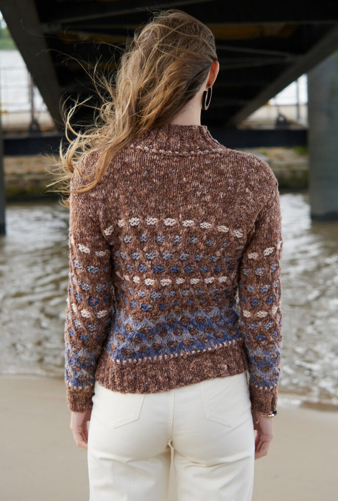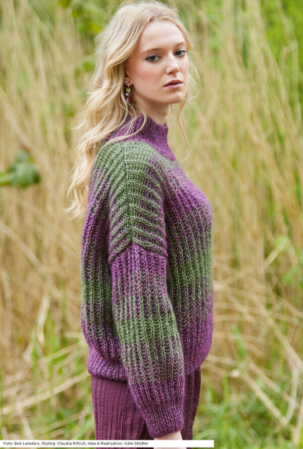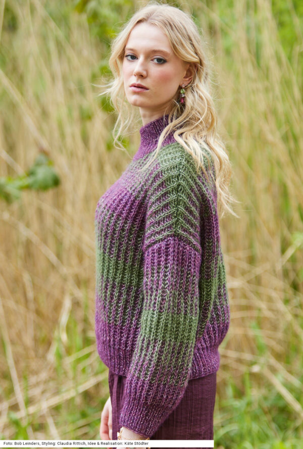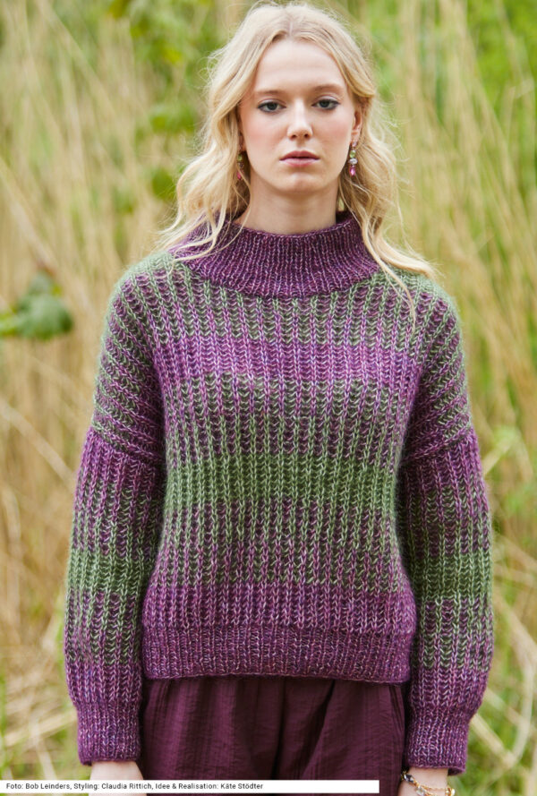Aus Mischgarn in nordischer Tweedoptik wird dieser sportliche Pulli mit gerade eingesetzten Ärmeln mit Nadeln Nr. 6 gearbeitet. Das Hebemaschenmuster ist ganz einfach; es erhält seine Spannung durch die wechselnden Farben (Natur, Hellblau und Jeansblau) der kraus rechts gestrickten Reihen zwischen den in Haselnussbraun gestrickten glatt rechten Streifen. Am Turtleneckkragen wird kurz nach dem Auffassen der Maschen noch einmal das Hebemaschenmuster in Natur wiederholt, danach werden 2/2-Rippen gestrickt. Die Anleitung dazu steht für die Größen 38/40, 42/44 und 46/48 zur Verfügung.