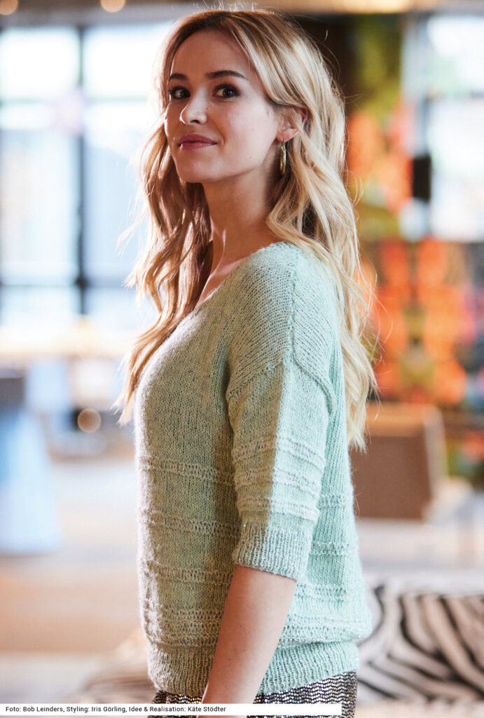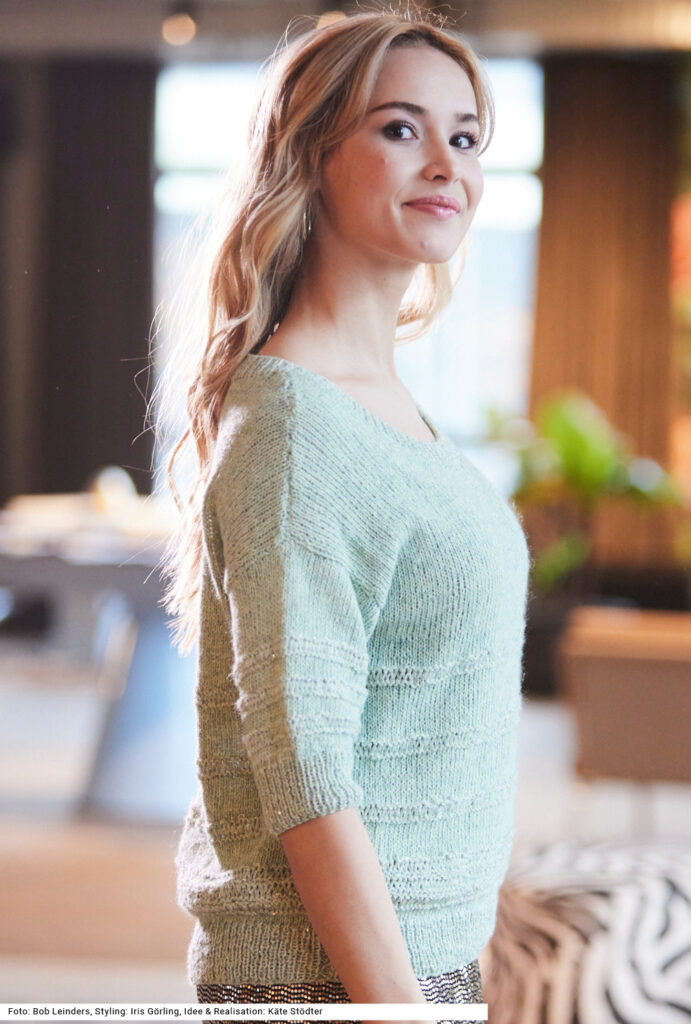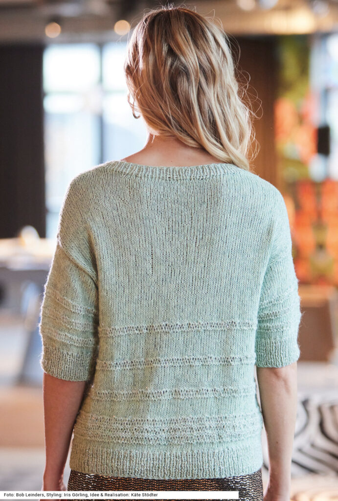 Ein einfach zu strickender Pulli, an den sich auch AnfängerInnen mit ein wenig Erfahrung wagen können. Glatt rechts und Fallmaschen sind leicht zu stricken. Die ellbogenlangen Ärmel verstecken auch etwas üppigere Oberarme. Gearbeitet wird mit einem jadegrünen Baumwolle-Alpaka-Polyamid-Garn, der Clou jedoch: Nur bei den gerippten Bündchen und der Ausschnittblende sowie bei den Rippen- und Fallmaschenreihen ein Paillettengarn mit verstrickt wird, wodurch auf den zweiten Blick eine elegante Note entsteht. Der weite runde Halsausschnitt lässt das Dekolleté besonders schön erscheinen. Eine Anleitung hierfür gibt es für die Größen 36/38, 40/42 und 44/46.