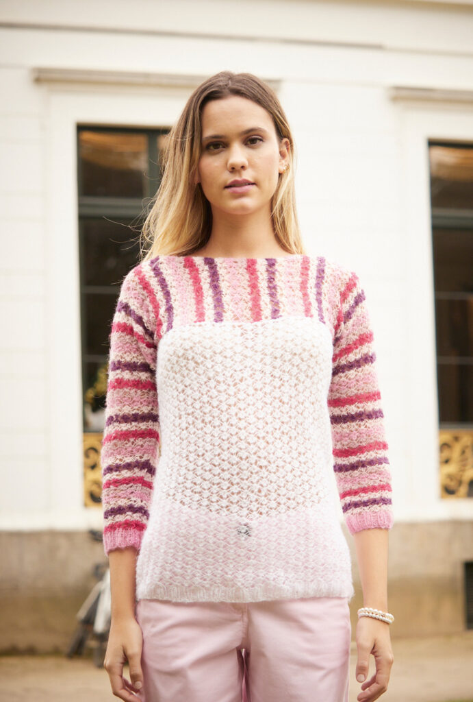 Dieses Modell wirkt aus der Ferne wie ein Zweiteiler – es ist jedoch ein raffiniert designter Ajourmuster-Pulli, der vom Kontrast zwischen der quer gestrickten Streifenpasse in Beerentönen (Rosé, Lila, Hautfarbe, Rosa, Hellrosa, Pink) und dem strahlend-weißen Vorder- und Rückenteil lebt. Den Pulli spürt man kaum, dank des hauchzarten Garn aus Schurwolle, Alpaka und Seide. Gearbeitet wird von einem Ärmel zum anderen in einem Stück inklusive Passe. Alle Bündchen sind als 2/2-Rippen gestrickt. Die Anleitung dazu gibt es für die Größen 34/36, 38/40 und 42/44.