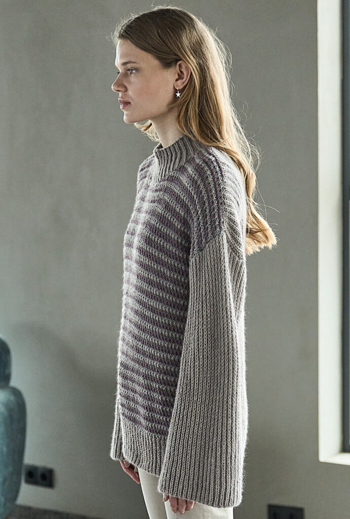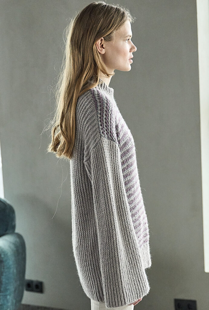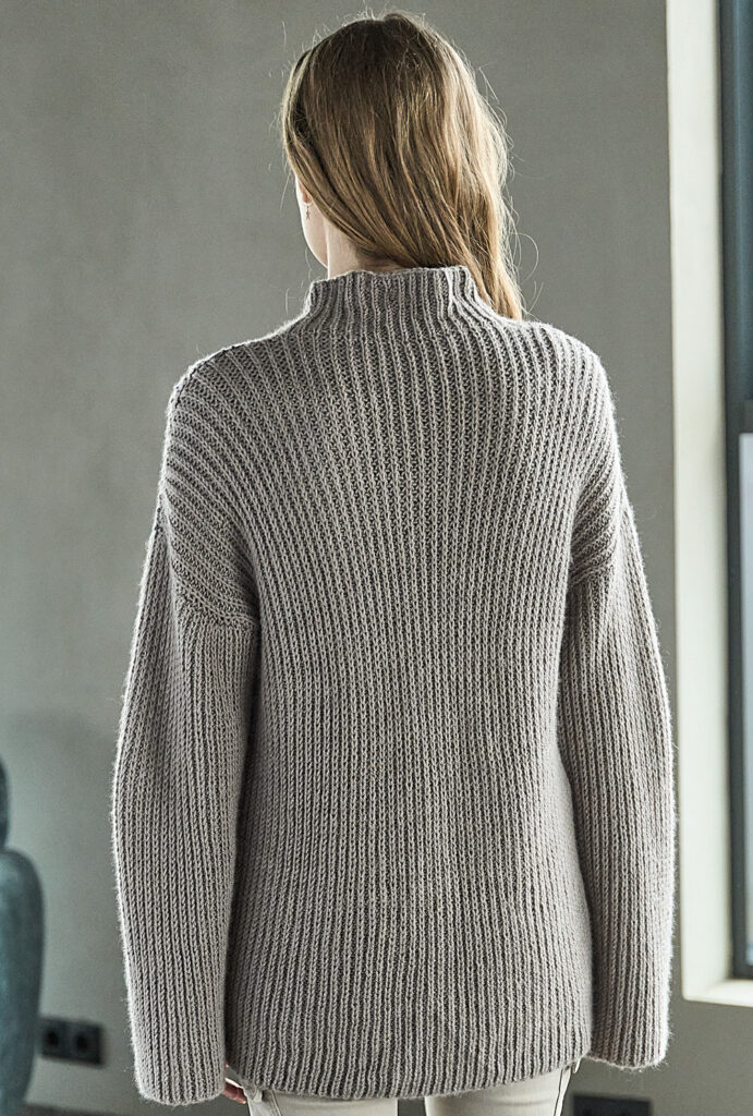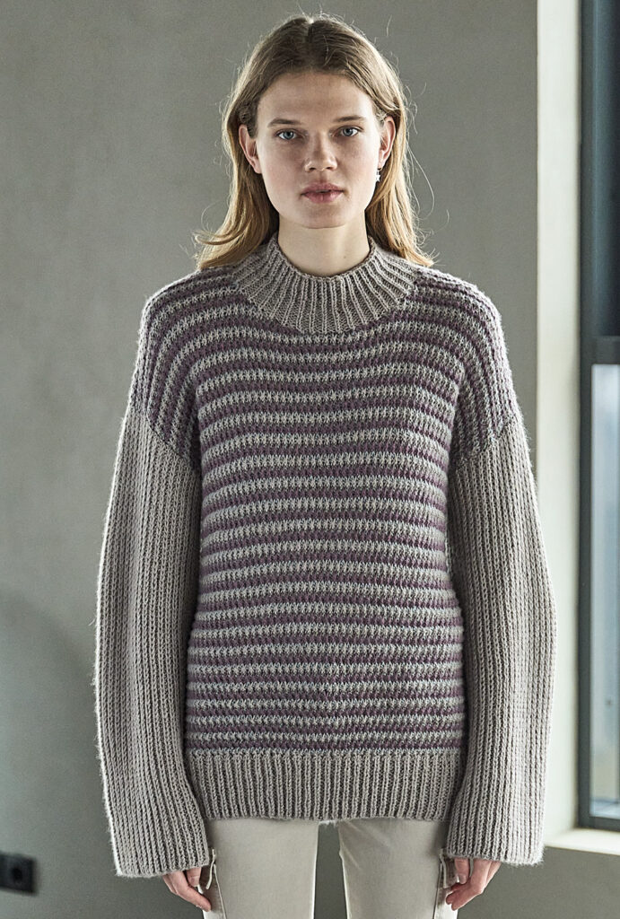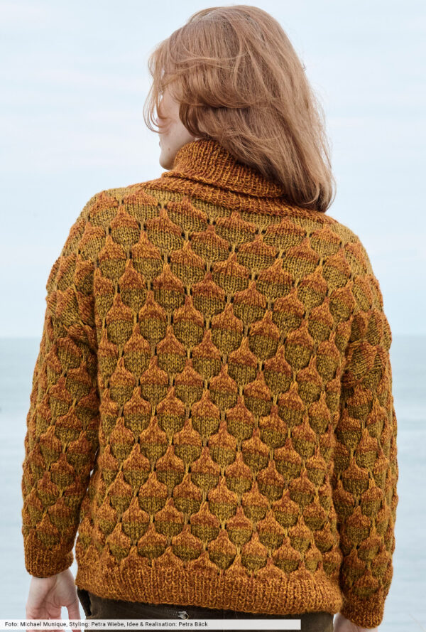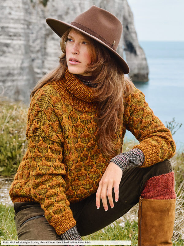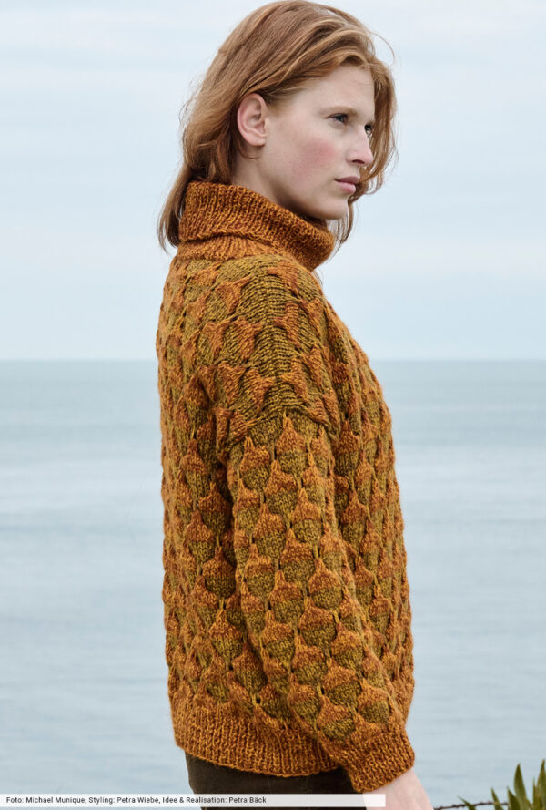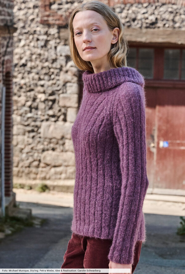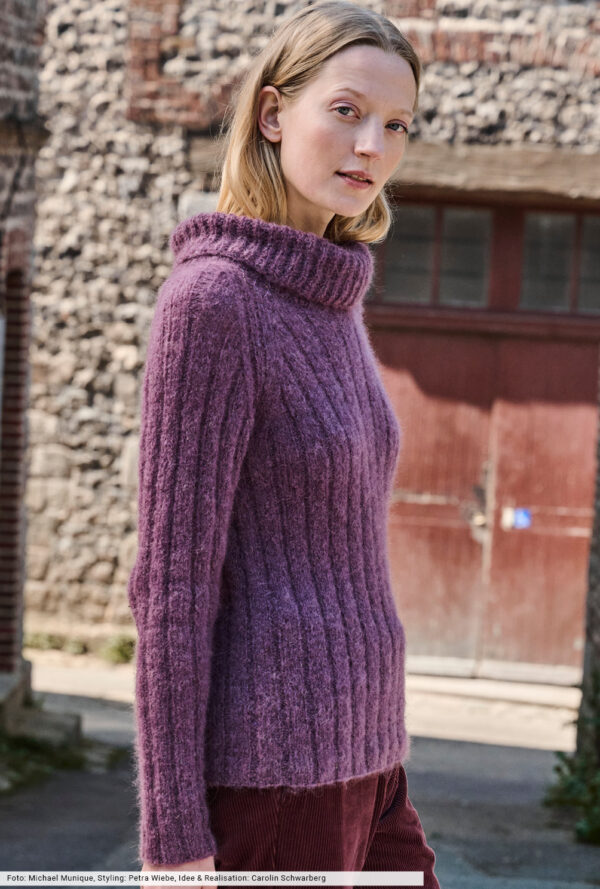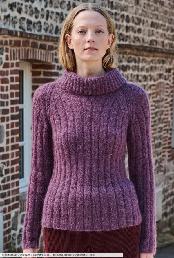Wie mit Raureif überzogen: Die nebligen Pastelltöne vereinen sich hier zu einem Hebemaschenmuster, das sich nur beim Korpus in Szene setzt. Die weiten Ärmel, die Rippenbündchen und die hohe Halsblende entstehen im Halbpatent – das sind tolle Rippenstrukturen, die lässige Ausstrahlungskraft und sportiven Chic vermitteln. Aus edlem Aplakagarn entsteht daraus ein aparter Pullover, der länger als eine Saison deine Garderobe vervollständigt und sich jedem Stil perfekt anpasst.