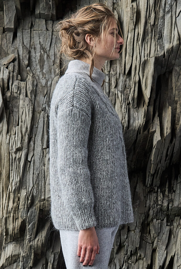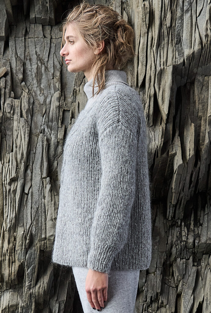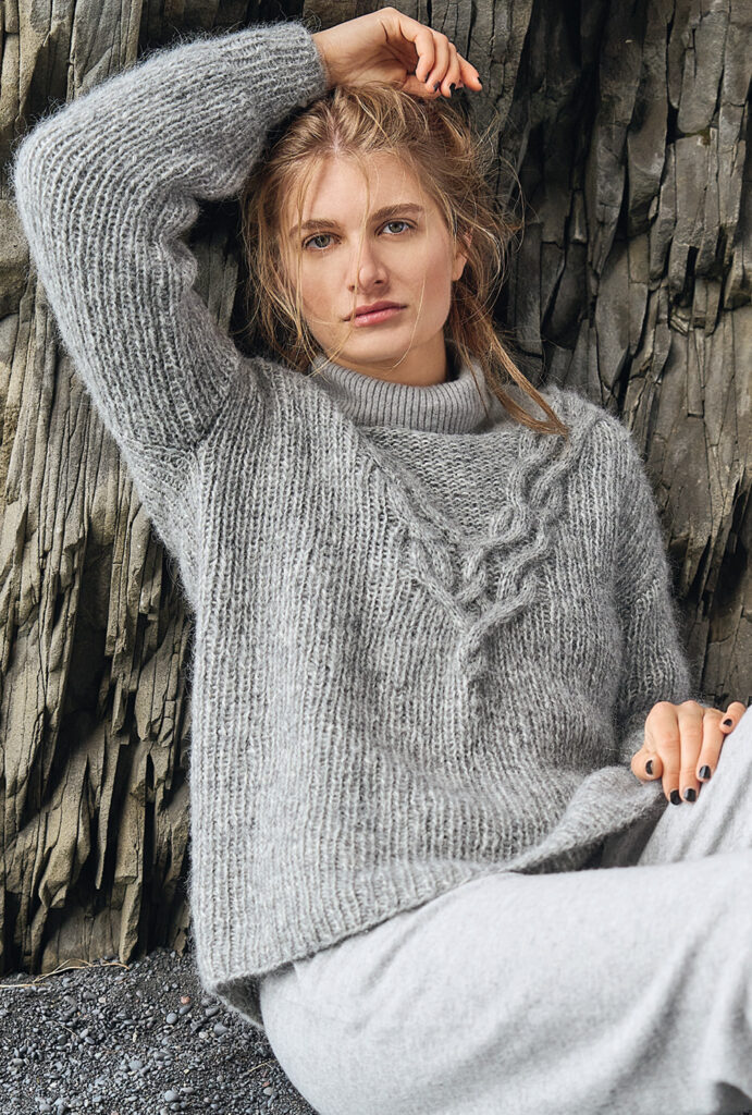 Rippen und Zöpfe sind eine Kombination, die immer funktioniert. Hier präsentieren sich die kunstvoll verschlungenen Maschen zu einem V-förmigen Detail, das nur am Vorderteil zum Einsatz kommt und das dir mit einer übersichtlichen Strickschrift die Arbeit erleichtert. Das feine Alpaka-Baumwollgarn wird doppelt verstrickt, so erhalten nicht nur die Rppenstrukturen das notwendige Format, sondern der Pulli wird mit Nadel 5,5 auch im Nu fertig. In neutralem Grau ein toller Begleiter, der durch seinen geraden Schnitt immer eine gute Figur macht.