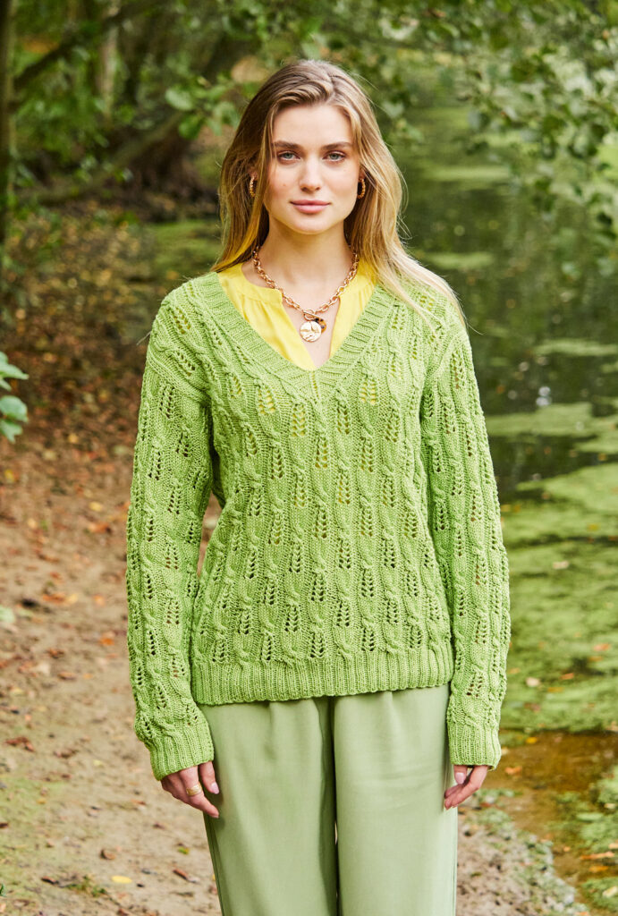 Klassischer Schnitt, eine bequeme Weite und ein tiefer V-Ausschnitt, der sowohl ohne als auch mit T-Shirt oder Bluse getragen werden kann. Ein dreidimensionales Zopf-Lochmuster sticht ins Auge, hervorgehoben durch die glatt linken Streifen dazwischen; die 2/2-Rippen an Bündchen und V-Ausschnitt bilden den Kontrast. Und dazu eine angesagte Farbe: Maigrün und ein sommerliches Garn aus reiner Baumwolle. Gerade eingesetzte Ärmel ergeben leicht überschnittene Schulterpartien und sind unkompliziert einzunähen. Die Anleitung kann in den Größen 38/40 und 42/44 sowie 46/48 downgeloadet werden.