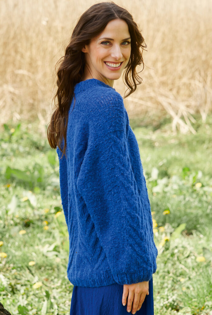 Dieser kuschelige Pullover in einem bezaubernden Blau wird in Einzelteilen von oben nach unten gestrickt. Die locker sitzenden Ärmel werden als Sattelärmel gearbeitet und bilden gleichzeitig die Schulterpassen und den Ausschnitt. Klingt kompliziert? Ist es aber gar nicht. Durch den detaillierten Schnitt ist der Aufbau deses besonderen Projektes gut nachzuvollziehen. Das sich verjüngende Zopfmuster kann ebenfalls durch die genaue Strickschrift super nachgearbeitet werden. Das flauschige Alpaka-Wollmischgarn gibt es bei JUNGHANS WOLLVERSAND und gearbeitet wird in der Nadelstärke 5 und 5,5. Zur Wahl stehen die Größen 36/38, 40/42 und 44/46. An die Nadeln und schon geht es los!