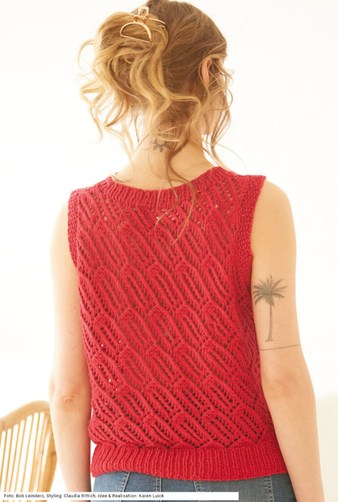 Ob Pullunder oder Top – das bleibt dir überlassen – am besten beides, denn dieses Modell aus reiner Baumwolle mit Rundhalsausschnitt ist das perfekte Beispiel dafür, dass Stricksachen sehr vielfältig zu tragen sind. Kräftiges Rot und ein scheinbar schräg liegendes Ajourmuster passen wunderbar zu Hose oder Rock mit Blumenmuster, in dem dieses Rot sich dezent wiederholt. Für das Strickmuster gibt es eine aufwendige Strickschrift, nach der das Arbeiten zwar Konzentration erfordert, aber technisch keine allzu große Herausforderung darstellt. Bund und Ausschnittblende sind im Rippenmuster, die Armausschnittblenden im Perlmuster gestrickt. Die Anleitung ist für die Größen 36/38, 40/42 und 44/46.