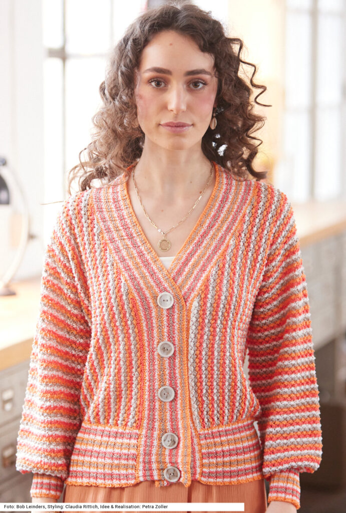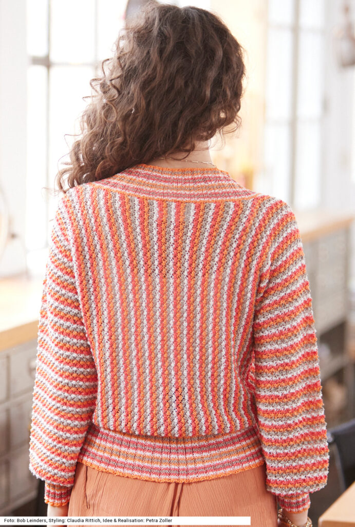 Eine quer samt Ärmel gestrickte Jacke mit V-Ausschnitt und hohem Rippenbündchen ist überaus bequem zu tragen, auch dank der weiteren Ärmel, die gerade mal bis knapp über die Ellenbogen reichen. Das Baumwoll-Viskose-Garn bringt mit seinem edlem Glanz die feinen Farb-Streifen groß raus. Auch der nachträglich angestrickte breite Saumrand und die ebenfalls breiten Vorderteilblenden werden in wechselnden Farben gearbeitet. Rippenmuster, kraus links und Dornröschenmuster wechseln sich ab. Die Anleitung steht für die Größen 36/38, 40/42 und 44/46 zum Download bereit.