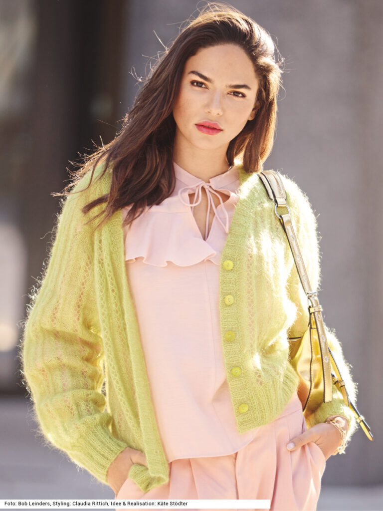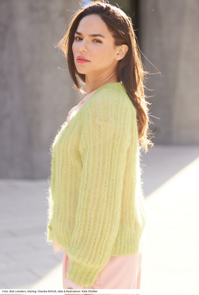 Diese klassische Jacke in zartem Hellgrün gibt jedem Look einen luxuriösen Charakter. Das liegt am edlen Garn aus Mohair und Seide, das kuschelig und zugleich federleicht ist. Das Muster ist einfach, es werden Lochstreifen und glatt links gestrickte Streifen gestrickt, alle Bündchen und die Knopf- bzw. Ausschnittblende sind im 2/2-Rippenmuster gearbeitet. Für die breiten betonten Raglanschrägen wird ebenfalls Rippenmuster aus 2 Maschen rechts, 2 M links gestrickt. Eine Anleitung kann für die Größen 36/38 und 42/44 sowie 48/50 downgeloadet werden.