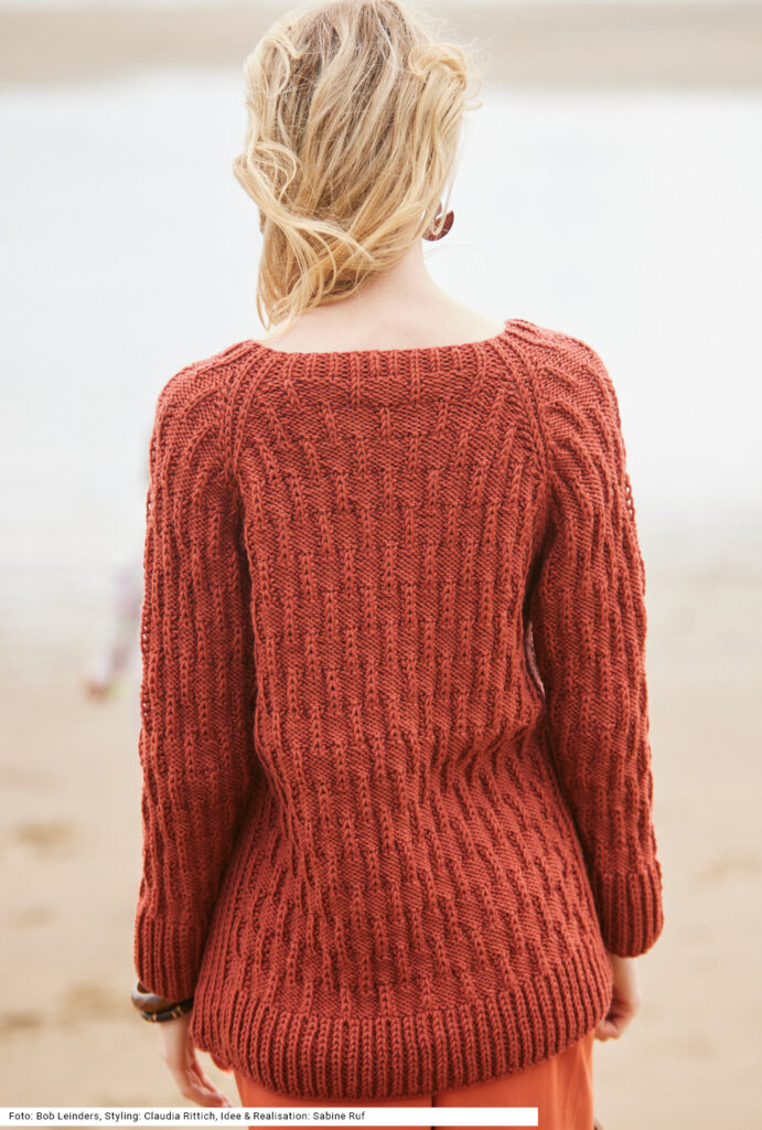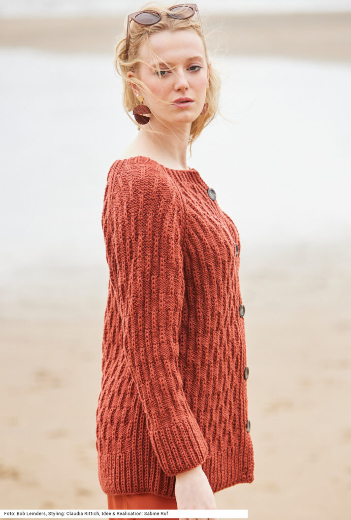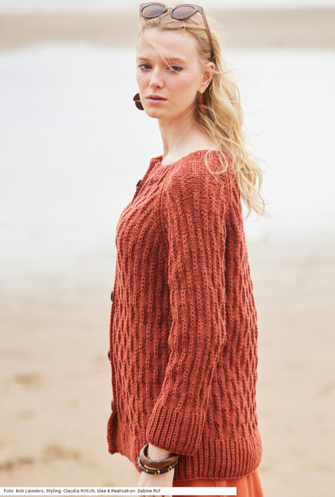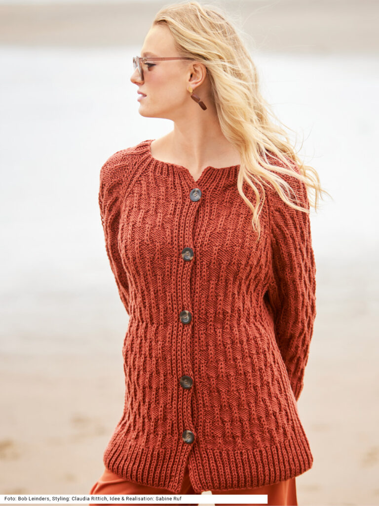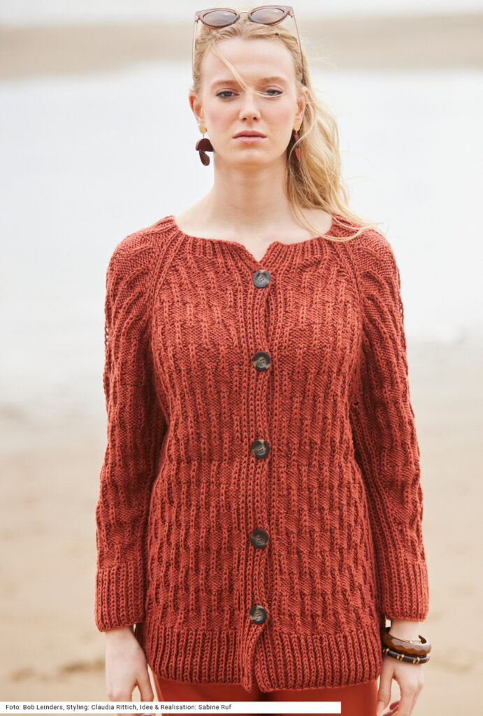 Die warme, robuste Raglanjacke aus terrakottafarbener reiner Schurwolle wird von oben nach unten in einem Stück gearbeitet. Das plastische Strukturmuster besteht aus linken und Halbpatent-Maschen. Auch die Raglanschrägen sowie der Bund an Rumpf und Ärmeln und die Knopfblenden sind mit einem Halbpatent-Rippenmuster betont. Man sollte schon Erfahrung haben, um sich die Freude beim Stricken dieser außergewöhnlichen Jacke zu gönnen. Schwer ist das Muster nicht, jedoch braucht es Zeit und man muss aufpassen beim Einteilen der Maschen. Die Anleitung dazu gibt es in den Größen 38/40, 42/44 und 46/48.