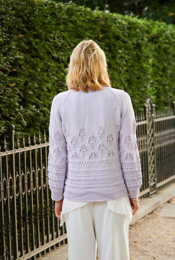 Ein Leckerbissen für alle versierten StrickerInnen, denen einfaches geradeausstricken zu eintönig ist. Bei dieser Jacke mit einem spannenden Mustermix aus abgehobenen Maschen, langgezogenen Maschen, die verkreuzt werden, Ajour- oder Patentmuster kommen Strickenthusiasten auf ihre Kosten. Die betonten Abnahmen an den Raglanschrägungen und die in Doubleface gestrickte Ausschnittblende tun ihr Übriges. Die Knopfblende ist im Halbpatent gearbeitet; zum Anschlagen der Maschen gibt es einen doppelten Kreuzanschlag. Alle Bündchen sind im 1/1-Rippenmuster gearbeitet. Das Garn ist aus reiner Öko-Baumwolle. Eine Anleitung hierzu kann für die Größen 36/38 und 44/46 downgeloadet werden.