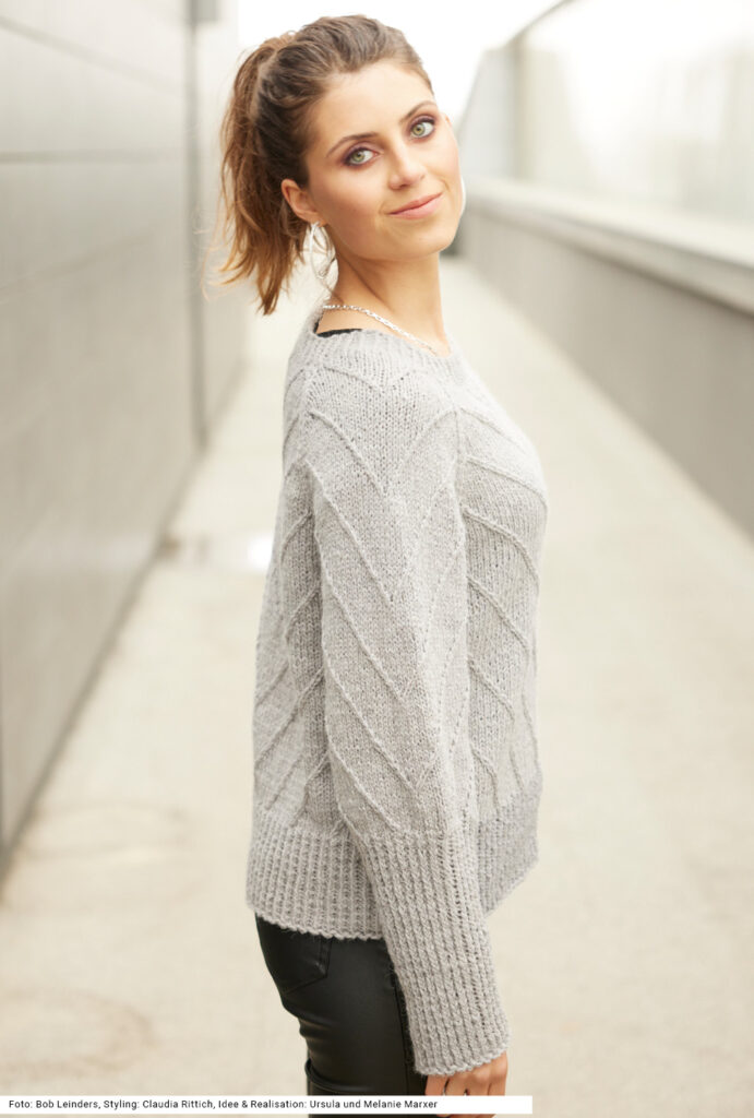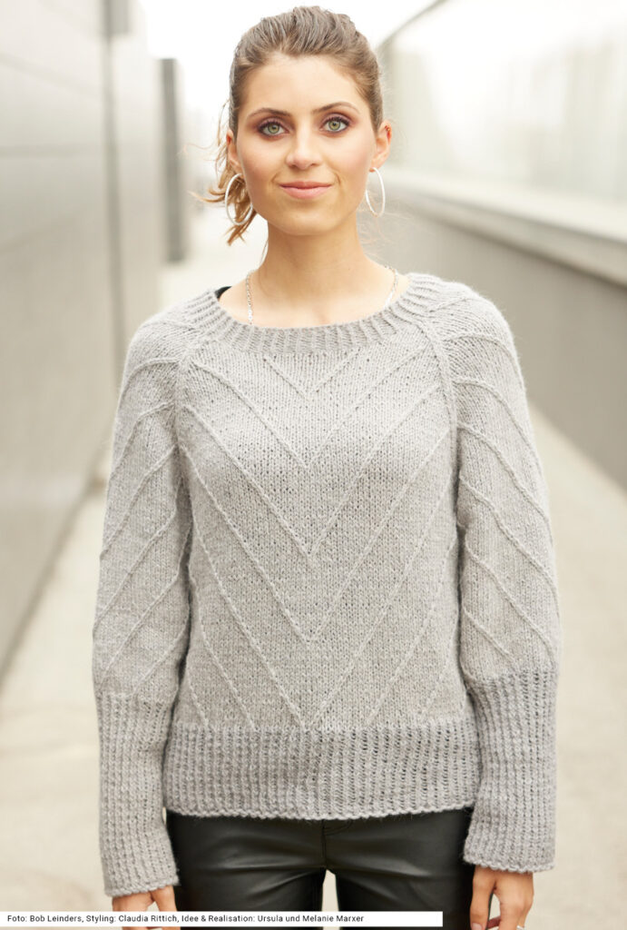 Dieser Pulli mit v-förmiger Mustereinteilung und betonten Raglanschrägungen streckt die Figur optisch. Die diagonalen Schrägungen entstehen durch zwei miteinander verzopfte rechte Maschen. Das Modell wird aus einem luftig-leichten Alpaka-Polyamid-Mischgarn in Grau gearbeitet, das sehr weit läuft und dadurch. Ein bis zu den Armausschnitten gerader Schnitt und die modisch hohen Ärmelbündchen im Rippenmuster, dazu ein weiter runder Halsausschnitt machen den modernen Style komplett. Das Rippenmuster wird 1 Masche rechts verschränkt, 1 Masche links gestrickt. Eine Anleitung steht für die Größen 36/38, 40/42 und 44/46 bereit.