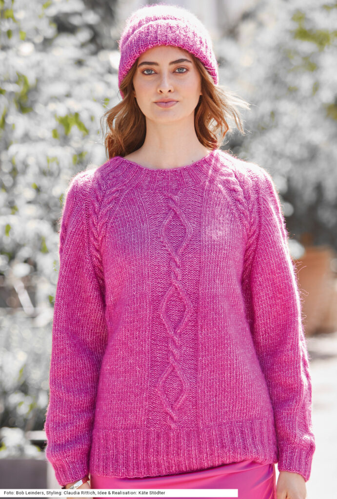 Sabrina Strickjournal Raglanpulli mit Zöpfen und Mütze im Patentmuster in Zyklam