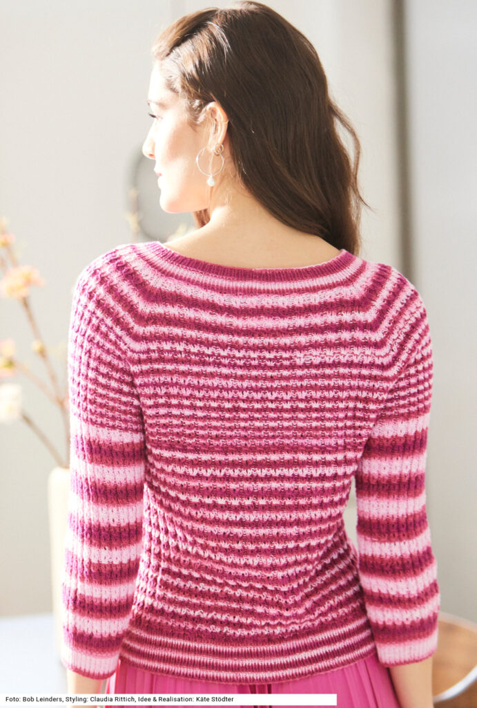 Dieser körpernahe Pullover fasziniert mit seinem ausgewogenen Ton-in-Ton Farbverlauf, der einfach aus dem Knäuel kommt und je nach Maschen- und Reihenzahl mal breiter, mal schmaler ausfällt. Gestrickt wird mit dünnen Nadeln und einem reinen Baumwollgarn. Vorder- und Rückenteil zusammen sowie die dreiviertellangen Ärmel sind bis zu den Armausschnitten in Runden gearbeitet, dann werden alle Teile zusammengesetzt und mit Raglanschrägen bis zum Halsausschnitt in Runden fortgesetzt. Überwiegend aus dem kleinen Zöpfchenmuster gestehend, werden Bündchen und Ausschnittblende im 1/1-Rippenmuster gestrickt. Eine Anleitung gibt es für die Größen 36/38, 40/42 und 44/46.