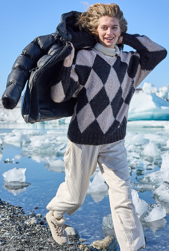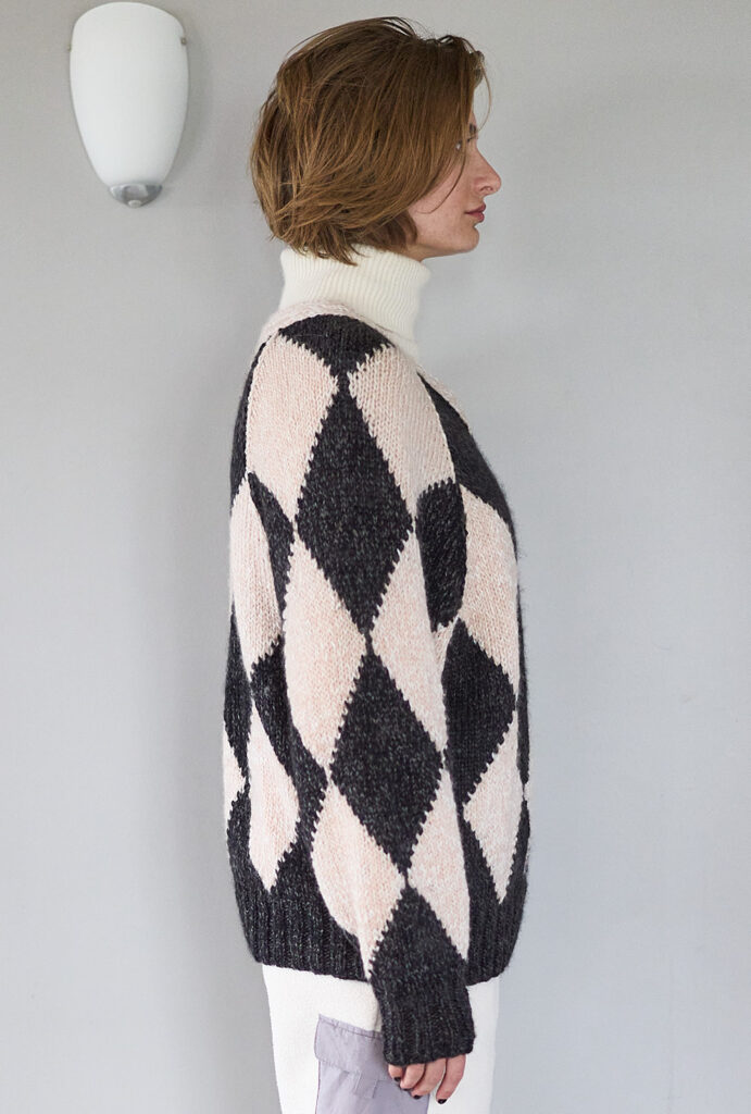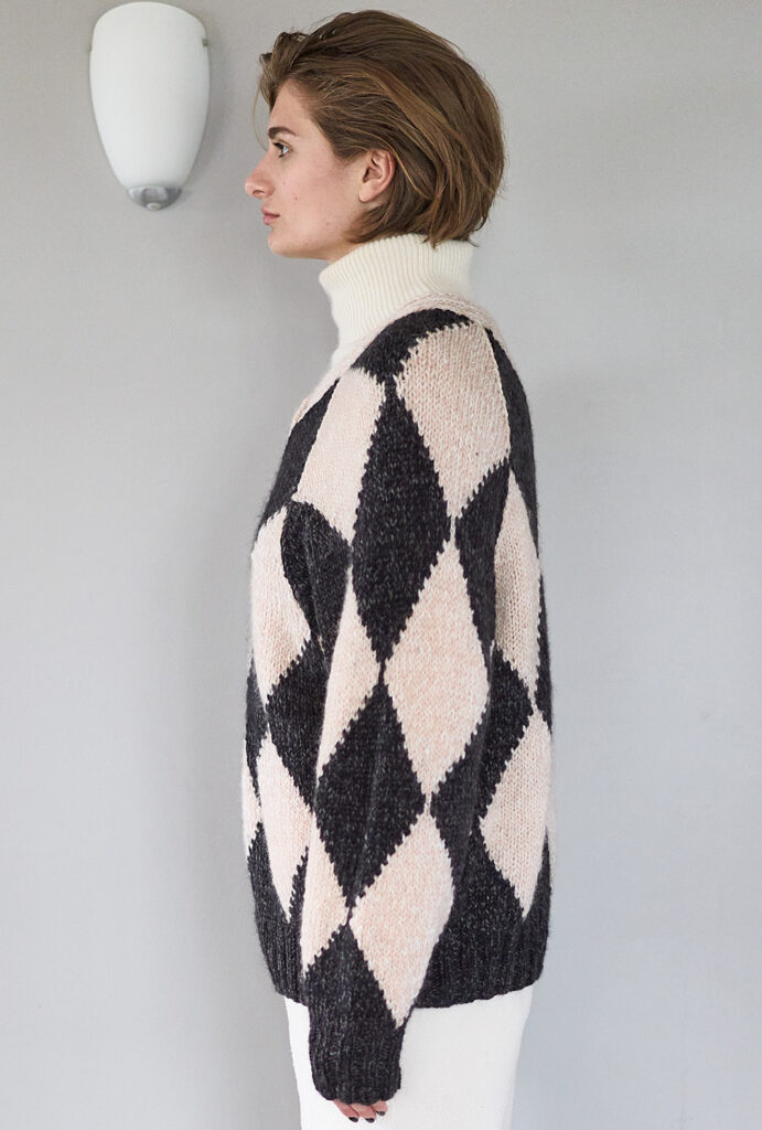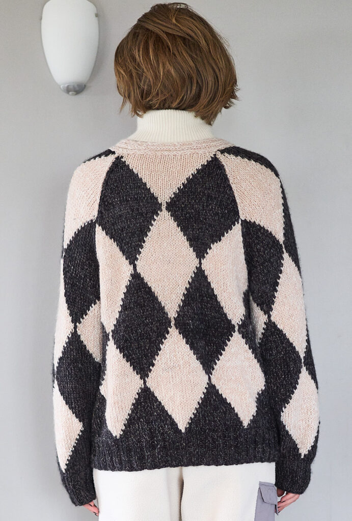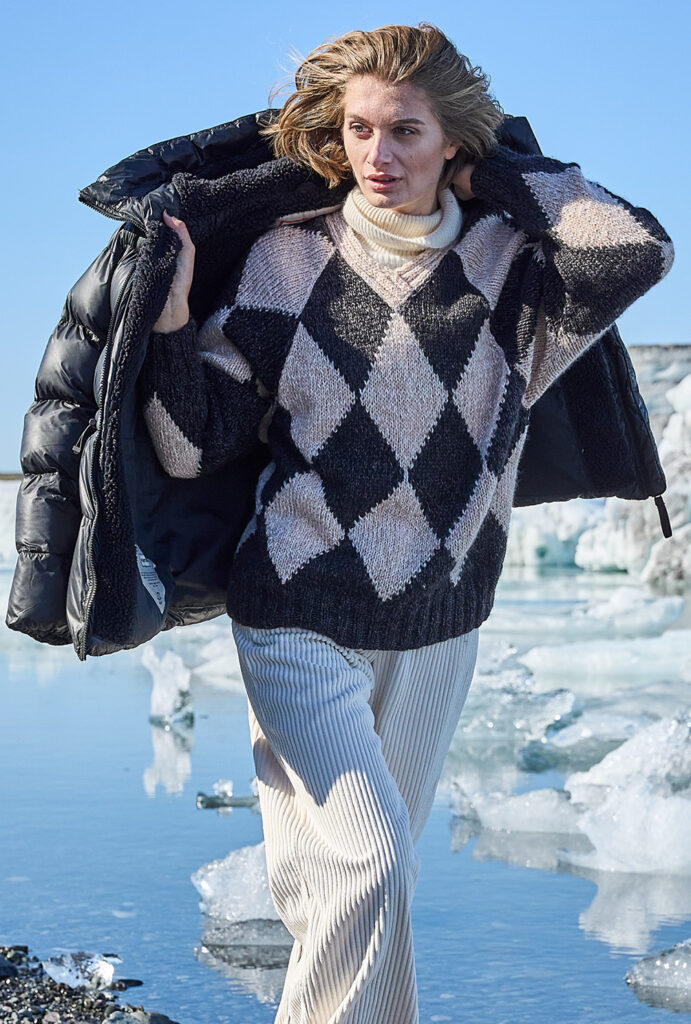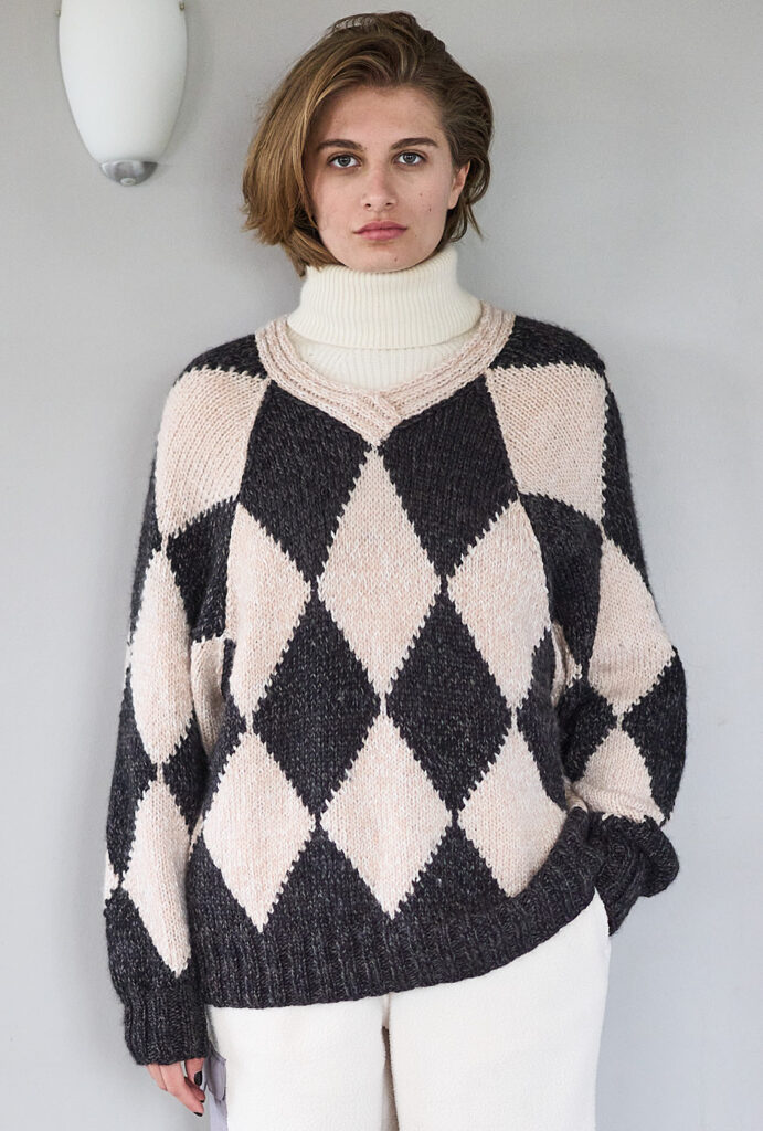 Schwarz und Beige schaffen klare Kontraste und präzise Linien. Das beweist der aparte Raglanpulli, dessen großzügiges Rautenmuster in Intarsientechnik entsteht. Das heißt Du verwendest für jede Farbfläche ein extra Knäuel und verkreuzt die Fäden auf der Rückseite der Arbeit, so entstehen keine Löcher. Tipp: Mit einer Maschenprobe kannst Du ein bisschen üben und kommst garantiert zum Erfolg. Das Finish bildet die V-Ausschnittblende, die separat gestrickt und in der vorderen Mitte übereinander gelegt an dem Halsausschnitt genäht wird.