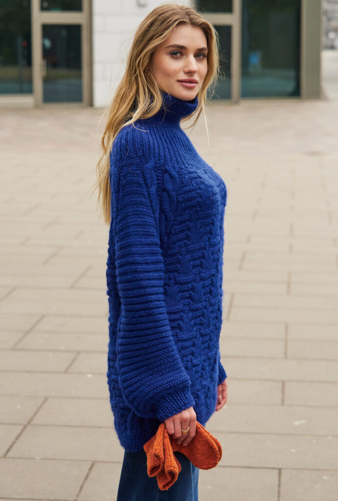 Sabrina Strickjournal Rollkragenpulli in Blau und Handschuhe in Orange mit Rechts-Links-Muster in Blau