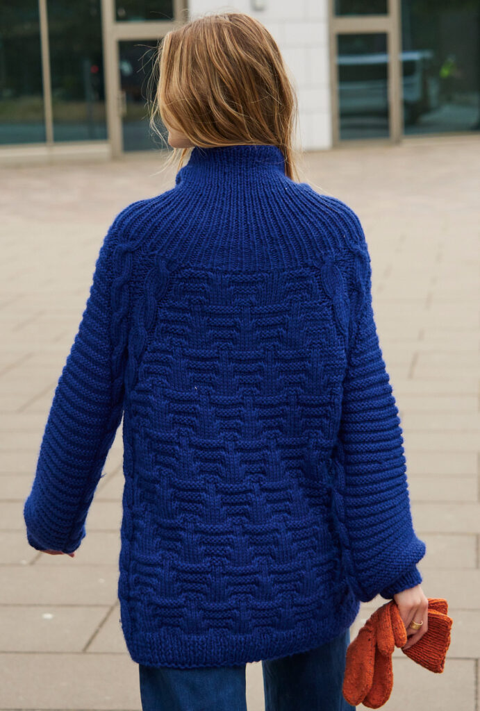 Das Set aus blauem Rollkragenpulli aus weichem, anschmiegsamen Polyacryl-Alpaka-Mischgarn und karottenroten Handschuhen aus Schurwoll-Mischgarn lebt von seinem markanten Mustermix. Neben dem Strukturmuster am Rücken- und Vorderteil sowie den Querrippen der Ärmel verlaufen gleich zwei prägnante Zöpfe entlang der Raglanschrägen. Interessant ist der hohe Stehkragen, beginnt er doch bereits als kurze Rundpasse im Rippenmuster gleich nach Ende der Raglans. Die robusten Handschuhe aus Tweedgarn nehmen das Strukturmuster des Pullis wieder auf. Hierfür gibt es eine Anleitung für den Longpulli in den Größen 40/42 und 48/50 und für die Handschuhe in Universalgröße.