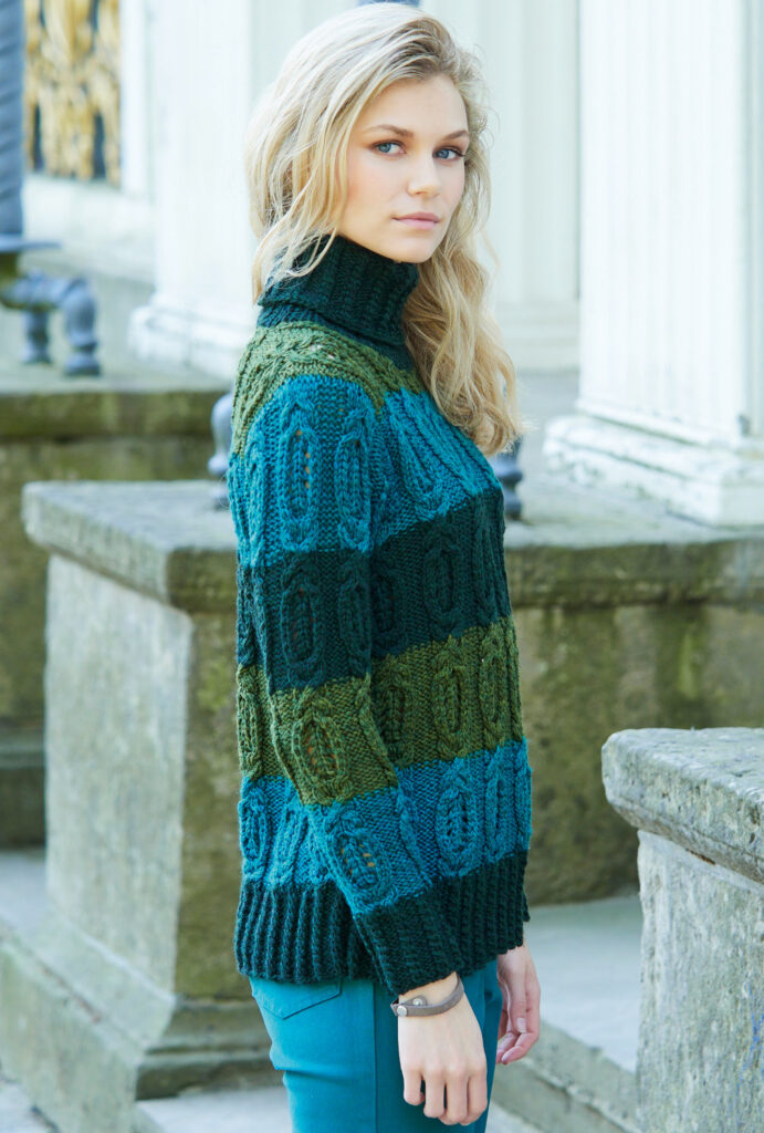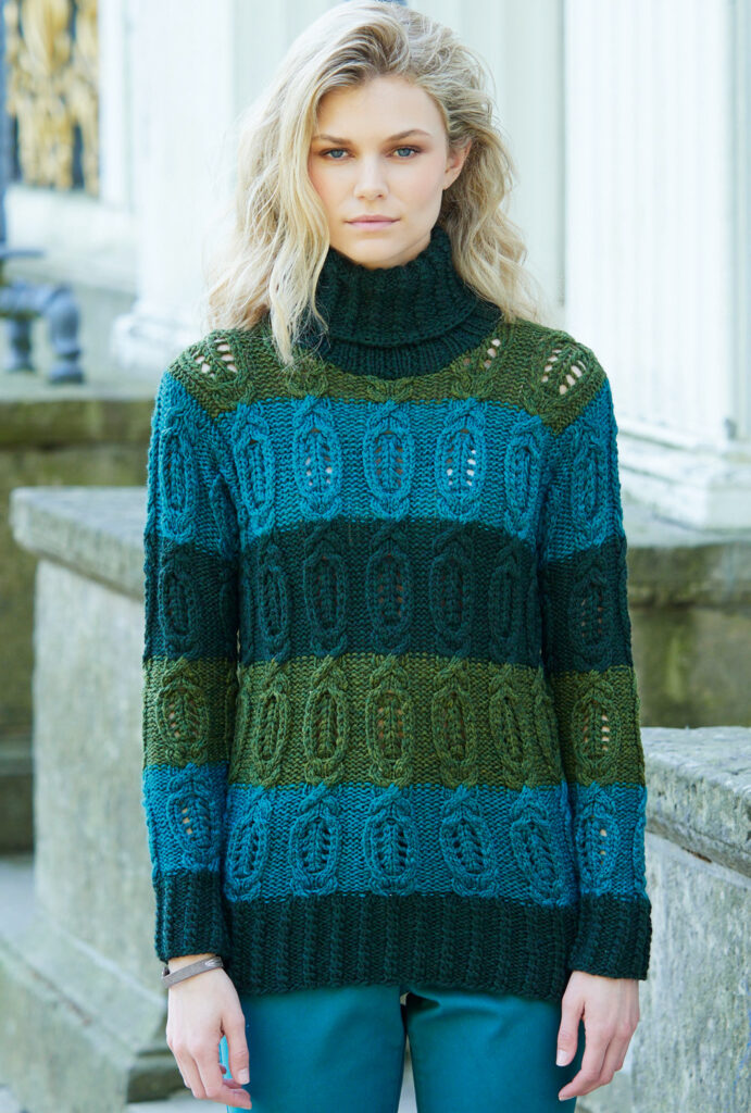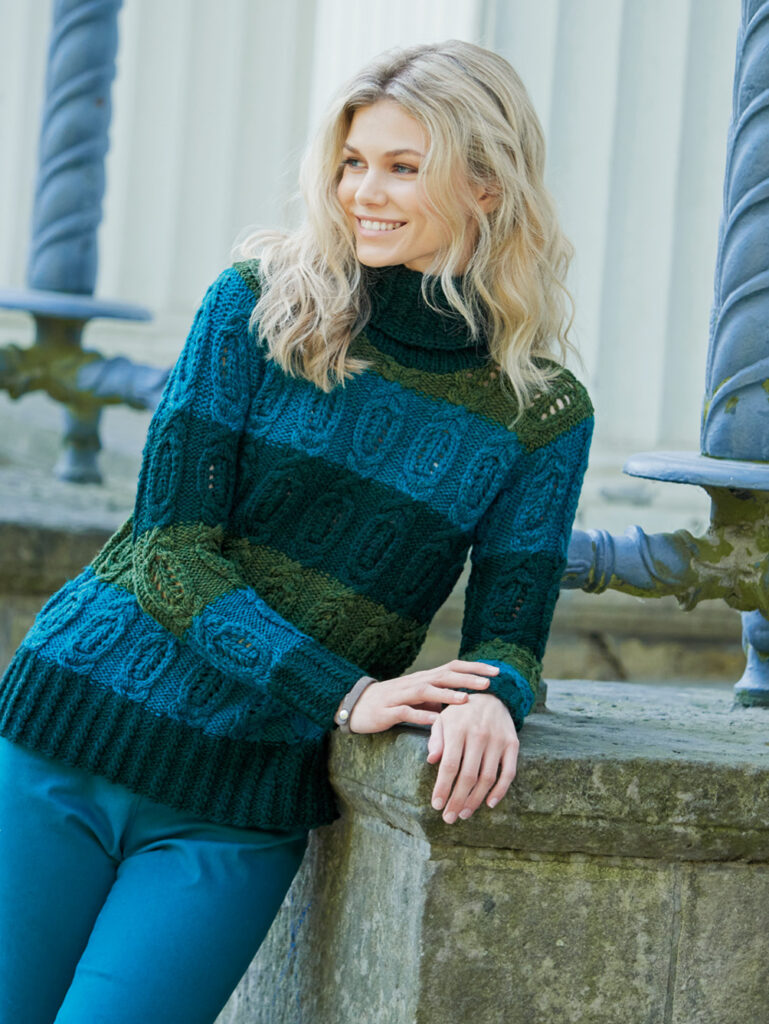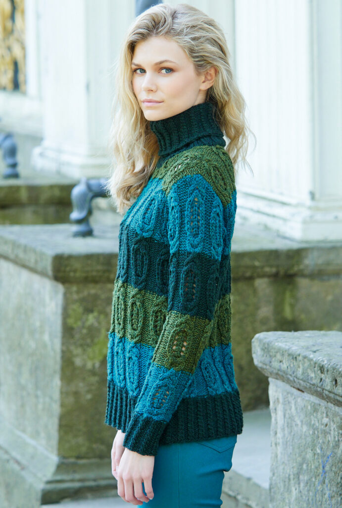 Tanne, Petrol und Moos – was für eine ausdrucksvolle Farbkombination! Wenn dann noch fantasievolle Ajourzöpfe ins Maschenspiel kommen, bei denen die Löcher nur ganz dezent innerhalb der Zöpfe erscheinen, entsteht ein Pulli der Extraklasse. Augenfällig sind die breiten Blockstreifen und ebenso die schmalen Zöpfchen zwischen glatt linken Streifen, die wie ein Rippenmuster die Bündchen und den Rollkragen zieren. Das Schnittmuster ist unkompliziert, da die Ärmel in einen eckigen Armausschnitt eingesetzt werden. Die Anleitung steht zum Download bereit für die Größen 36/38, 42 und 46/48.