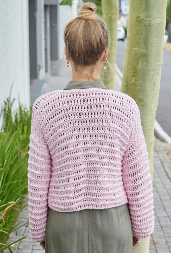 Die kurze geschnittene Jacke mit löchrigen Querrippen wird aus einem voluminösen Baumwollgarn mit wenig Synthetikbeimischung gestrickt; perfekt also für kühlere Sommerabende. Die schräge Wickeloptik der Vorderteile entsteht durch Abnahmen an der Vorderteilkante, die durch den versetzt angebrachten Knopf sich schräg nach oben streckt. Ansonsten werden Rückenteil und Ärmel gerade gearbeitet. An den Vorderteilkanten und dem Halsausschnitt werden am Ende Maschen aufgenommen und als I-Cord-Rand abgestrickt. Saum- und Ärmelkanten kommen ohne Blende oder Bündchen aus. Eine Anleitung gibt es für die Größen 36/38, 40/42 und 44/46.