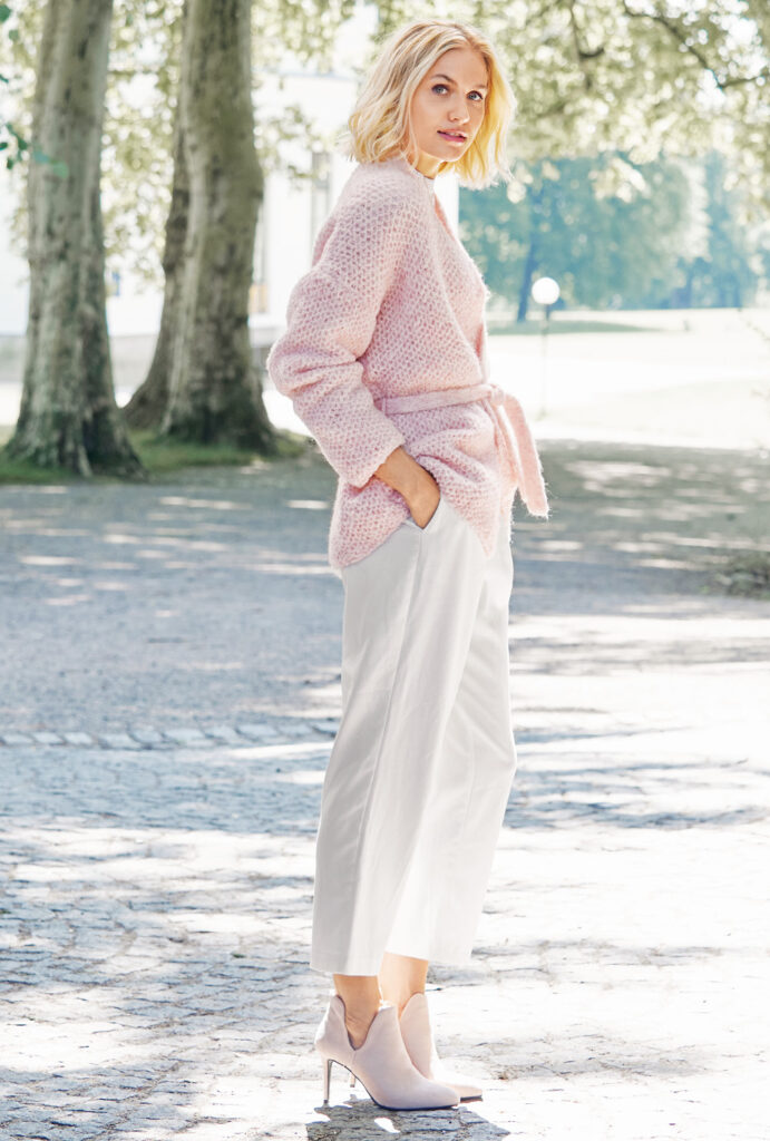 Beim Netzpatent muss man sich anfangs etwas konzentrieren, dann hat man aber nach kurzer Zeit den Dreh raus – und wird mit einer äußerst aparten Jacke aus roséfarbenem Flauschgarn belohnt. Außerdem ist das Netzpatent besonders für ausdauernde Strickerinnen geeignet, denn es geht nicht so schnell voran. Dennoch: Dieser Cardigan mit lockerem Bindegürtel im Tunnelpatent (Doppelpatent) wird dich lange begleiten, sodass sich die Arbeit in jedem Fall lohnt. Die Anleitung dazu gibt es für die Größen 38/40 und 42 sowie 44/46.