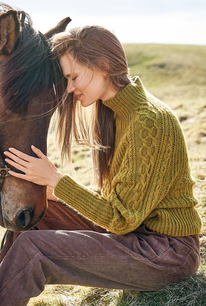 Warmes Senfgelb gibt dem Pulli aus exklusiver Alpakawolle den herbstlichen Flow. Aber der Wow-Effekt liegt in der Schnittführung: Du beginnst unten am Saum und strickst das Vorder- und Rückenteil in Runden, bis zum Beginn der Raglanschrägungen. Danach werden die Ärmel genauso gearbeitet. Dann alle Maschen auf die Nadel nehmen und die Passe mit den Raglanschrägungen ebenso in Runden stricken. Das Finish bildet der hohe Stehkragen. Nicht zu vergessen: die tollen Zopfmuster, bei denen dir die übersichtlichen Strickschriften zur Seite stehen.