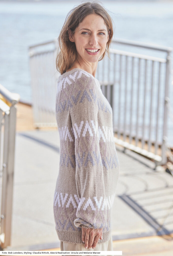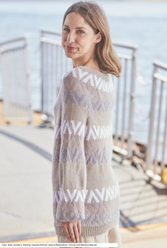 Dieser Pullover hat einen außergewöhnlichen Schnitt: Zunächst werden die einzelnen Teile ganz gerade von unten nach oben mit einer kurzen Raglanschrägung gearbeitet, dann folgt die rundgestrickte Passe. Zwischen den sandfarbenen Streifen gibt es Jacquardstreifen, mal in Grau, mal in Rosenholz, mal in Weiß mit sandfarbenem Hintergrund. Er ist aus einem besonders weichen und strapazierfähigen Microfaser-Garn (je 50 % Polyacryl und Polyamid) gearbeitet. Die Bündchen und die Halsausschnittblende sind im 1/1-Rippenmuster gestrickt. Eine Anleitung ist für die Größen 36/38 und 42/44 vorhanden.