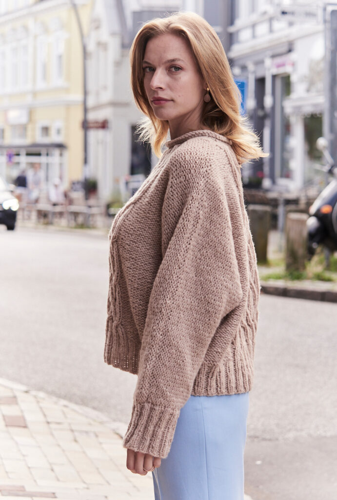 Das dekorative Zopfmuster in der Mitte von Vorder- und Rückenteil, das sich aus dem 2/2-Rippenmuster des Bunds entwickelt, wird flankiert von glatt rechts. Der Schnitt ist unglaublich bequem und ideal, wenn man eine etwas größere Oberweite hat, denn die Maschen für die Ärmel werden nach dem Bund in Federmausform zugenommen. Der runde Halsausschnitt bekommt einen kleinen Rollrand aus rechten Maschen. Eine Anleitung für dieses Modell aus sandfarbener Schurwolle mit etwas Polyester-Beimischung gibt es für die Größen 36 – 40 und 42 – 46 sowie 48 – 52.