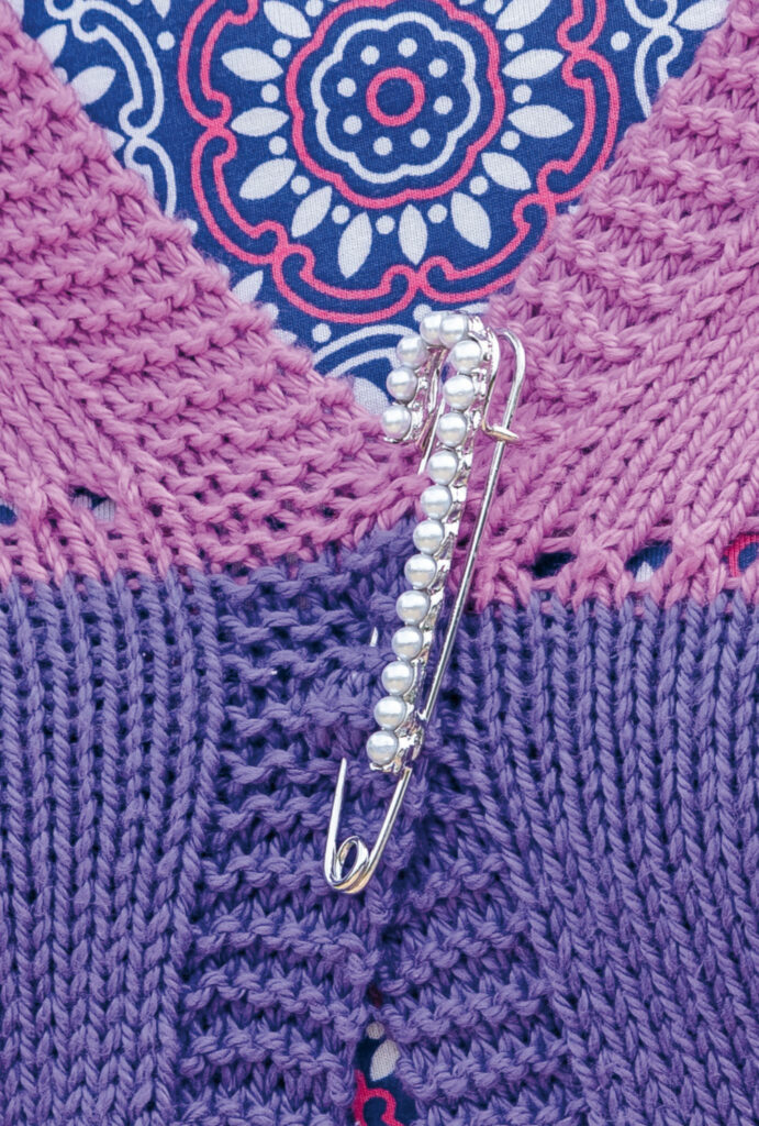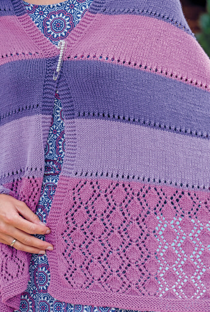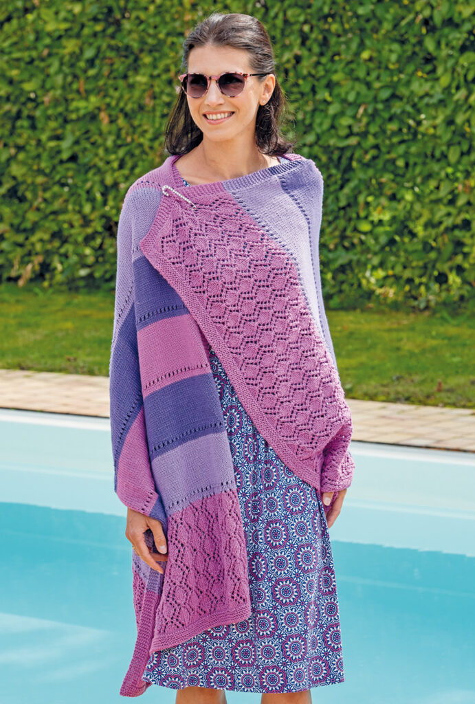Hübsch umhüllt: Das leichte Tuch mit Blockstreifen und der Ajourmuster-Bordüre sorgt selbst an etwas kühleren Sommertagen für angenehme Wärme an den Schultern. Es lässt sich mit einer großen dekorativen Schmuck-Sicherheitsnadel an den Schultern zusammenfügen. Gestrickt wird kraus rechts, glatt rechts und, für die Bordüre, im Ajourmuster.