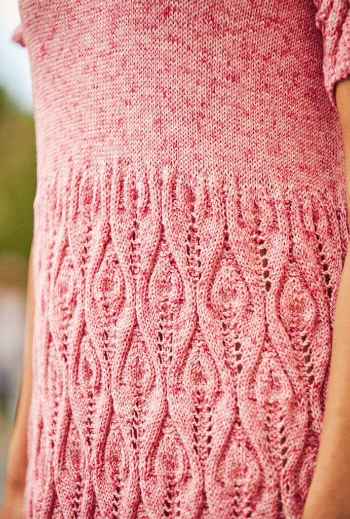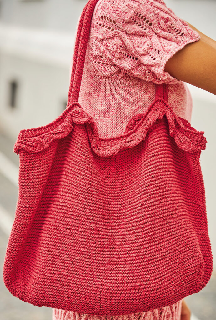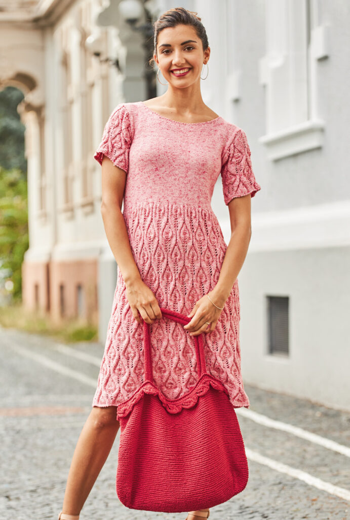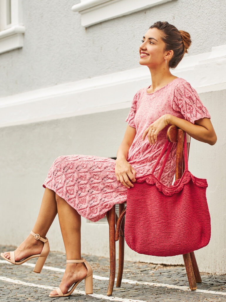 Perfekt gestylt für den Café-Besuch ist frau mit diesem Set aus schickem Strickkleid in Rot-meliert mit Blattmuster und praktischer Tasche mit Blattmusterrand! Das Kleid wird im Brustbereich glatt rechts, das Rockteil und die Ärmel werden im Blattmuster gestrickt. Die ausführliche Strickanleitung für die Größen 36/38, 42/44 und 46/48 inklusive Schnittzeichnung und Strickschrift erleichtert das Nachstricken auch etwas ungeübteren Strickerinnen. Die ca. 40 x 30 x 10 cm große, kirschrote Tasche passt perfekt dazu und bietet Platz für kleine Einkäufe. Sie wird kraus rechts gestrickt und erhält als oberen Abschluss einen dekorativen Blattmusterrand.