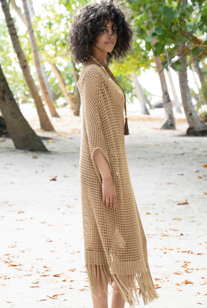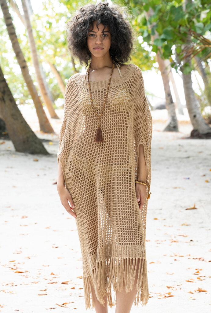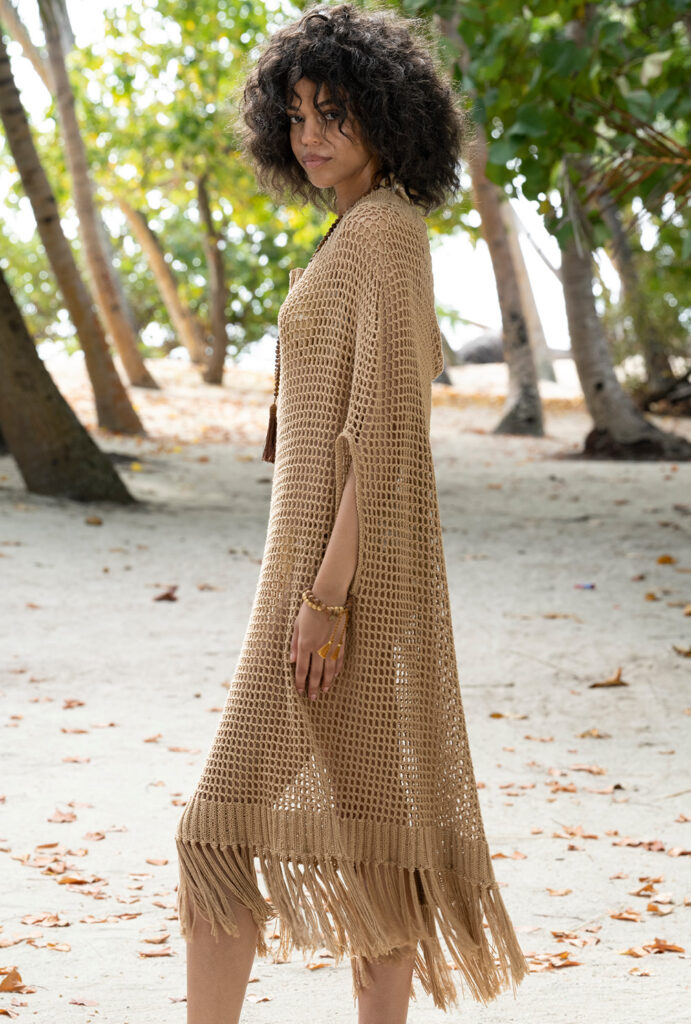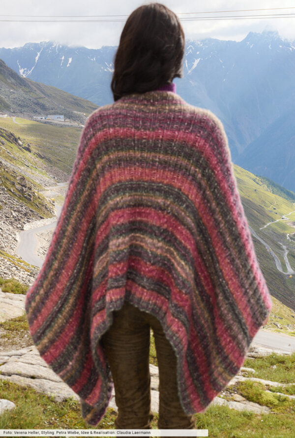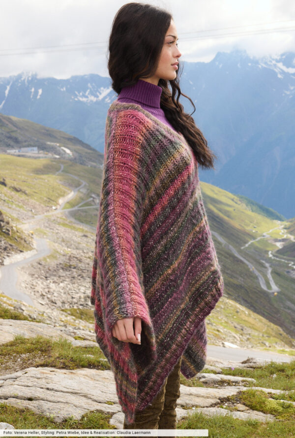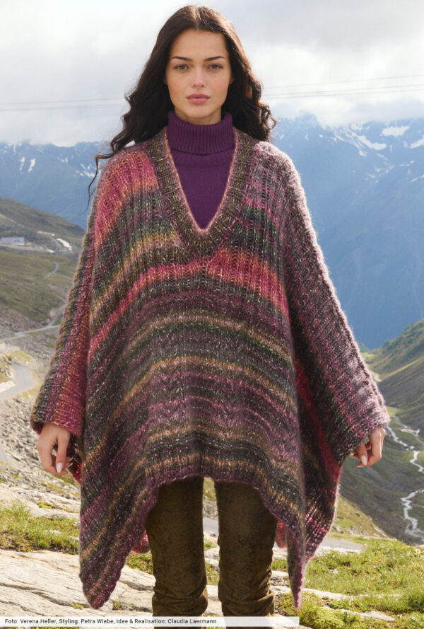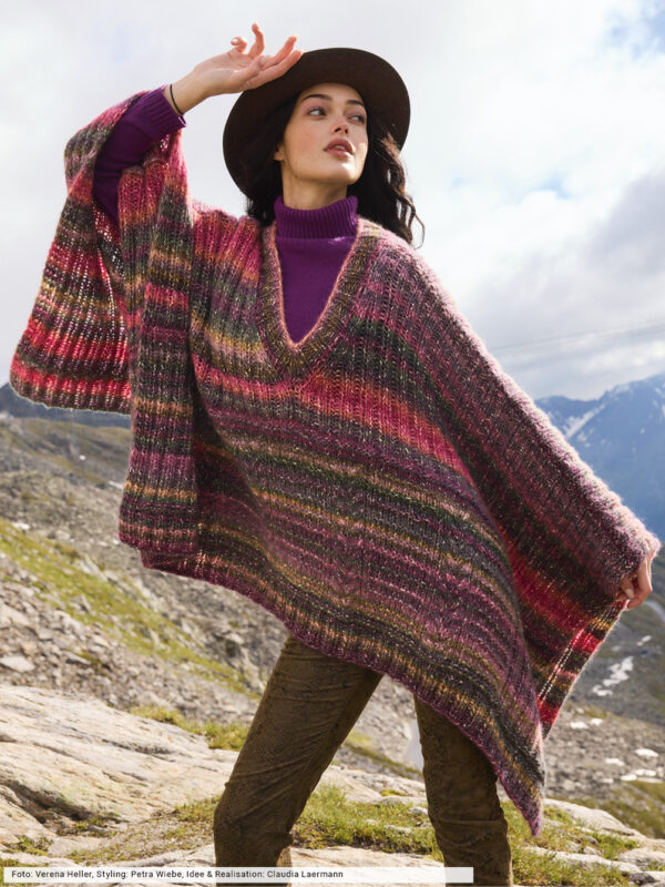 Der Poncho erfährt in dieser Saison eine ganz neue Popularität, da er sich in überraschenden Facetten zeigt. Hier ein besonders edles Stück aus recyceltem Seidengan. Die Form ist lang und schmal, mit hohen Schulterschrägungen und seitlichen Armeingriffen. Das transparente Gittermuster haben wir ganz einfach aus Luftmaschen und Stäbchen gehäkelt, der Bund und die Halsblende hingegen ist im Rippenmuster gestrickt. Das I-Tüpfelchen sind die langen Fransen, die in die Saumkante eingezogen werden.