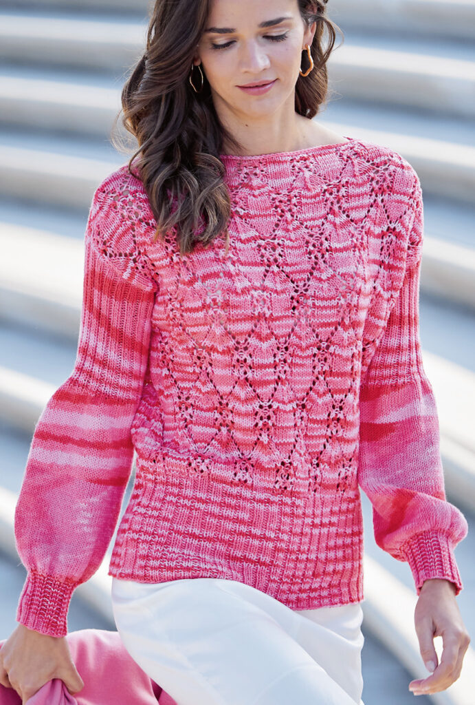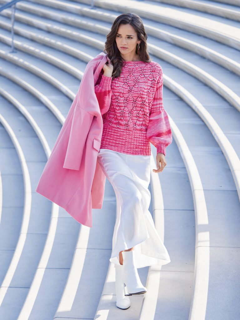 Von zartem Rosa bis hin zu leuchtendem Pink – der Farbverlauf des Baumwoll-Leinengarns ist beeindruckend und lässt genügend Raum für den Mustermix aus Ajour- und Rippenstrukturen. Besonderes Highlight sind die femininen Ärmel. Gestrickt wird der Sommerpulli in einzelnen Teilen von unten nach oben, erst im Rippenmuster, danach im Lochmuster. Das Ajourmuster braucht schon etwas Konzentration, ist jedoch nicht allzu schwierig und die übersichtliche Strickschrift hilft zusätzlich dabei, stets den Überblick zu behalten. Bei den Ärmeln wechseln sich Rippen und glatt rechts gestrickte Abschnitte ab – zusammen mit Zu- und Abnahmen entsteht so die ganz besonders schöne Ärmelform. Sind alle vier Teile fertig gestrickt, werden noch alle Nähte geschlossen und aus dem Halsausschnitt die Blende herausgearbeitet.
