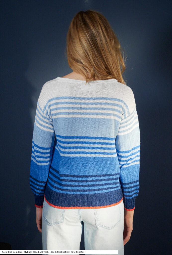 Dieser lässig-elegante, einfach zu strickende Streifenpulli ist sehr leicht, da er aus einem dünnen Garn gearbeitet wird – das erfordert zwar Geduld beim Stricken, belohnt jedoch durch das schöne Ergebnis. Die breiten Streifen in Dunkel-, Royal- und Hellblau vermischen sich in den schmalen Ringeln zwischen den breiteren Streifen. Hübsches Gimmick dazu: die gehäkelte Seestern-Brosche in Rot. Auch am Beginn der im 2/2-Rippenmuster gestrickten Bündchen kommt dieses Rot vor. Das Modell mit langen Ärmeln und breitem rundem Halsausschnitt wird aus einem Viskose-Baumwolle-Polyacryl-Mischgarn gearbeitet. Eine Anleitung steht für die Größen 36/38, 40/42 und 44/46 zur Verfügung.