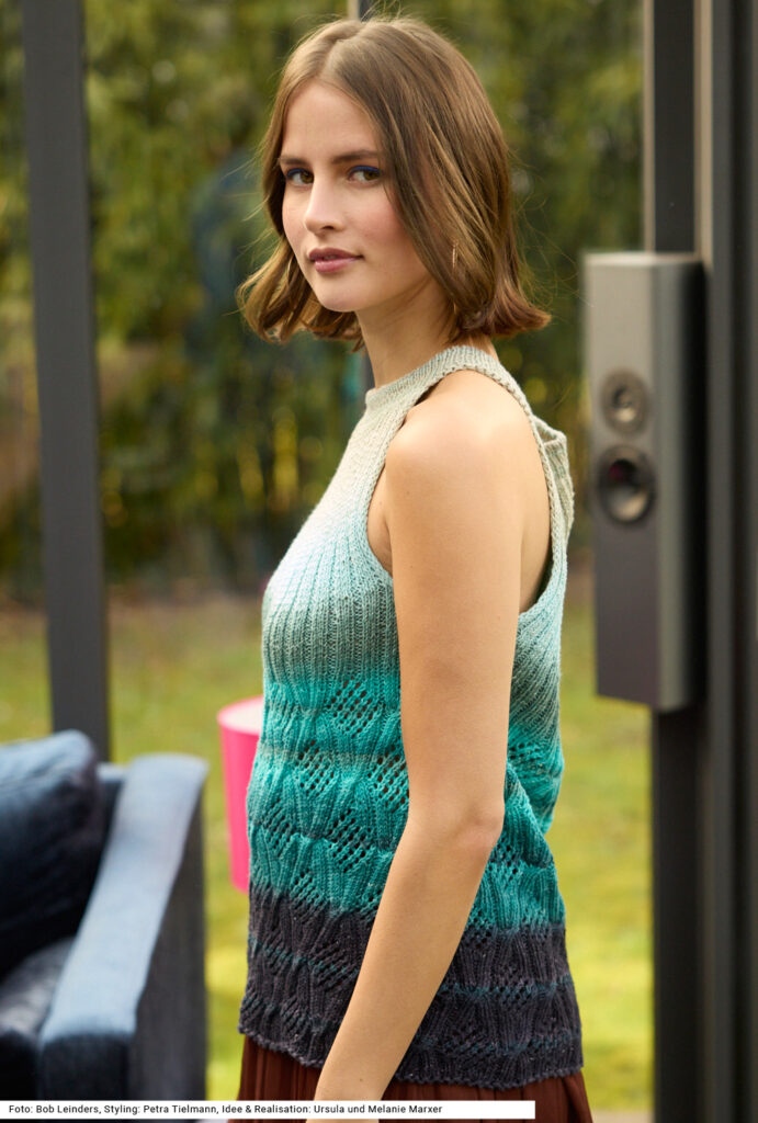 Schöne Schultern sollte man zeigen. Das gelingt sehr gut mit diesem ausdrucksstarken Top aus einem Baumwollgarn bei dem der harmonische Farbverlauf allein schon ein Hingucker ist. Es wird in einem Stück von unten nach oben in Runden gearbeitet. Das plastische Rautenmuster geht in ein elastisches Rippenmuster über, das sich ganz von allein (ohne Abnahmen) zum hohen Halsausschnitt hin zusammenzieht. Danach folgt nur noch eine breite doppelt gestrickte Blende. Die Anleitung dazu gibt es für die Größen 36/38, 40/42 und 44/46.