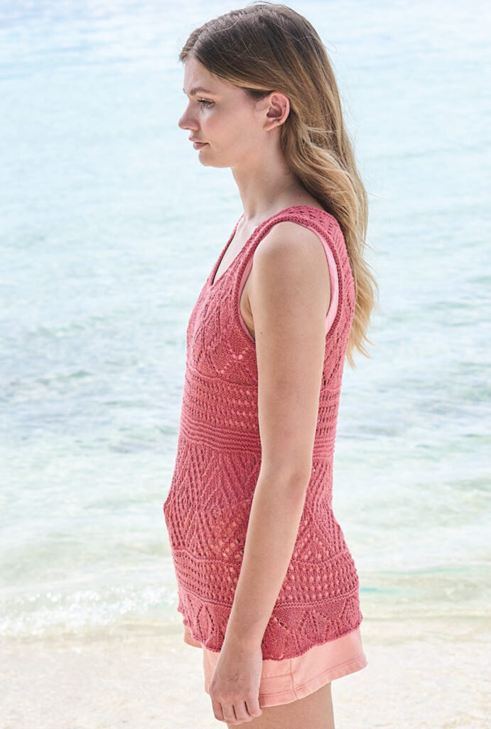 Viskose und Leinen sind die Zutaten für dieses ausdrucksvolles Top, das durch seine Vielzahl luftiger Ajourmuster auch bei heißen Temperaturen schön cool bleibt – und für Lochmuster-Fans jede Menge Abwechslung und Strickvergnügen bietet. Gleich vier unterschiedliche Muster kommen hier zum Einsatz: Ein luftiges Blattmuster, ein kleines Rautenmuster, ein Netzmuster und ein großes Ajourrautenmuster. Sowohl die Muster, als auch die Reihenfolge sind in der Anleitung detailliert beschrieben. Die Ajourmuster benötigen durchaus etwas Konzentration, die übersichtlichen und klaren Strickschriften der Anleitung helfen jedoch dabei, stets den Überblick zu behalten. Lediglich bei den Zu- und Abnahmen muss gut darauf geachtet werden, dass sich die Umschläge und zusammengestrickten Maschen stets ausgleichen. Gestrickt werden beide Teile von unten nach oben in der angegebenen Musterfolge. Sind beide Teile fertig gestrickt, werden noch die Nähte geschlossen und alle Ausschnitte erhalten noch schmale, angestrickte Blenden. Am besten nimmt das neue Sommertop dann noch ein kleines Bad und wird schön glatt ausgestrichen und liegend getrocknet. Dabei entfaltet das Ajourmuster seine volle Schönheit.