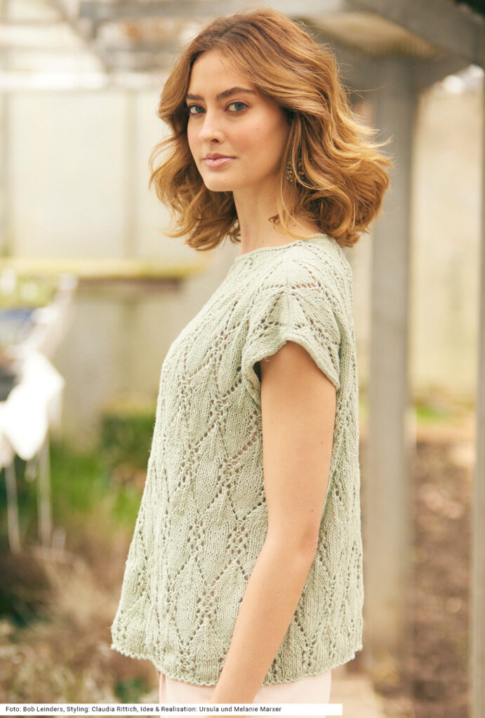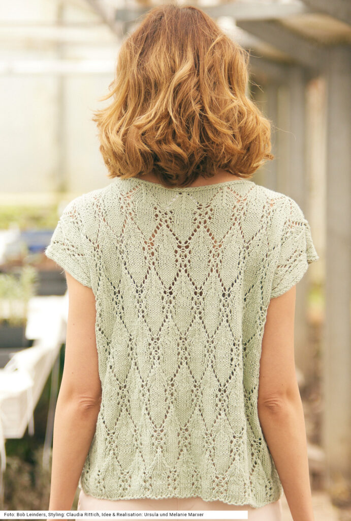 Es ist heiß in diesen Sommertagen, du magst aber trotzdem gern einen gestrickten leichten Pulli tragen? Dann ist dieses Top genau das Richtige. Es wird aus einem kühlen Hanf-Baumwolle-Gemisch gearbeitet. Auch wenn nur zwei Rechtecke dafür notwendig sind, sollte man etwas Strickerfahrung mitbringen, denn das rhombenartig verschlungene Ajourmuster erfordert Konzentration beim Stricken. Der U-Boot-Ausschnitt und die Armausschnitte bekommen noch eine I-Cord-Umrandung. Eine Anleitung für dieses resedagrüne Sommermodell steht für die Größen 36 – 40 und 42 – 46 sowie 48/50 zur Verfügung.