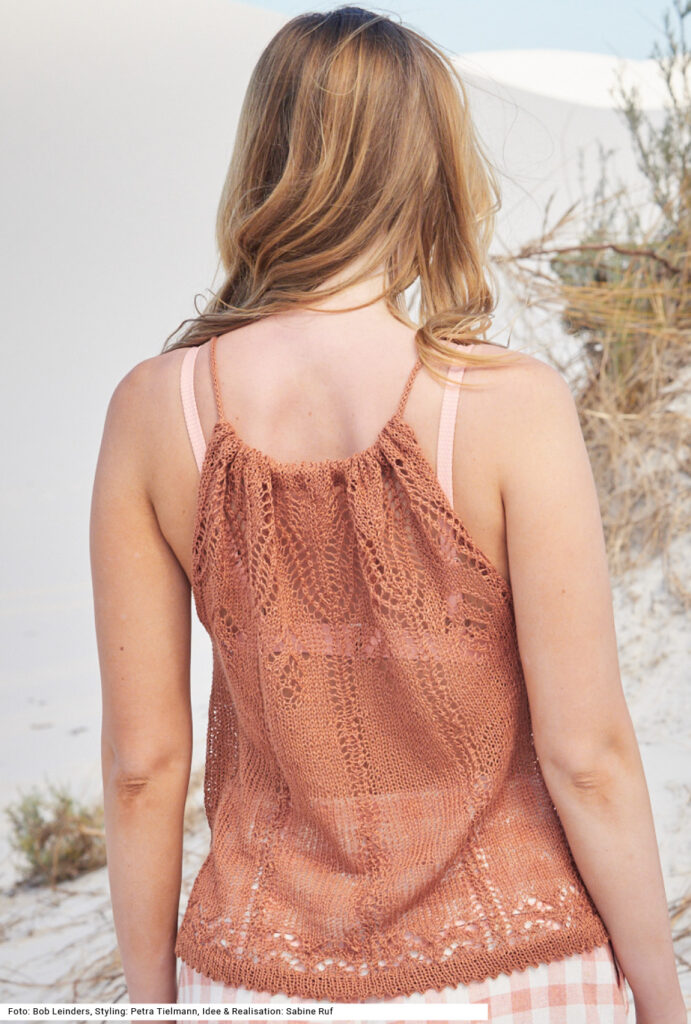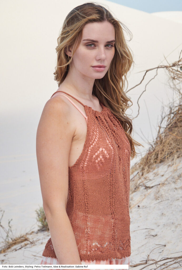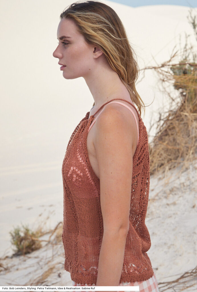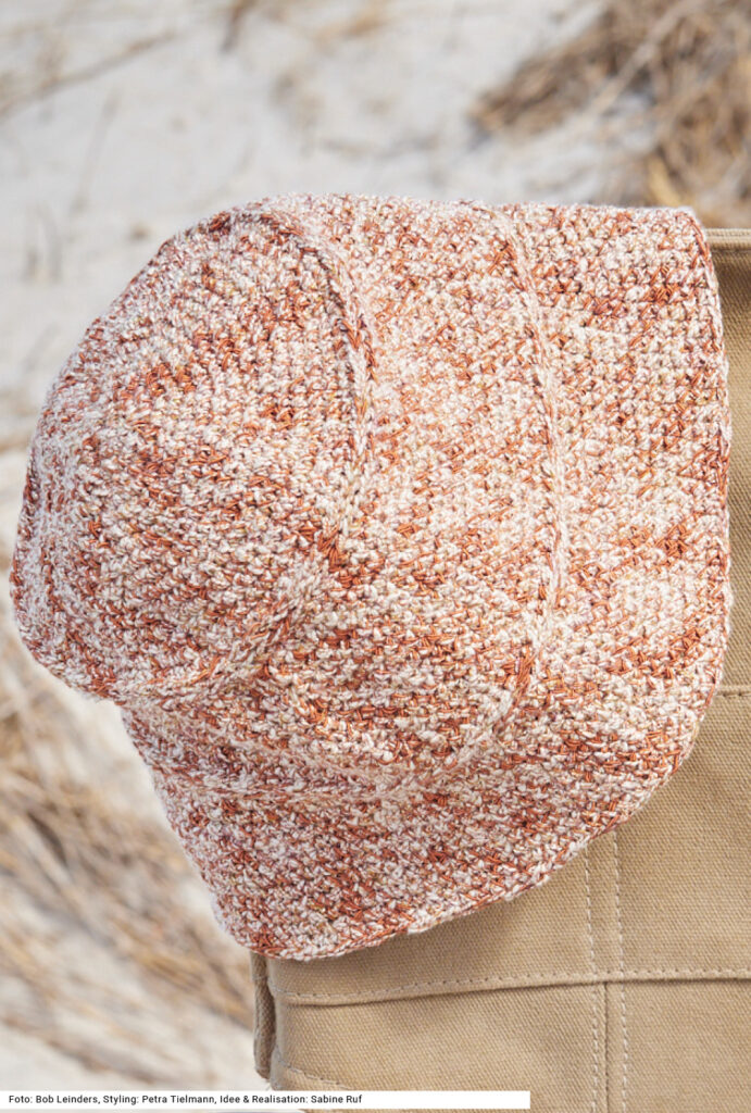 Dieses Set sollte in keinem Urlaubskoffer fehlen. Versierte StrickerInnen werden sich über die verschiedenen Ajourmuster freuen, bringen sie doch Abwechslung ins Strickvergnügen. Die beiden geraden Teile aus braunem reinleinenen Garn werden an den Schultern durch eine Kordel gehalten, die entweder mit einer Strickmühle oder als I-Cord gestrickt werden kann. Das farblich passende Fischerhütchen aus einem in Braun-Natur-Gold changierenden Baumwolle-Polyester-Garn mit leichten Glanzeffekten wird dreifädig aus festen Maschen in Runden gehäkelt. Eine Anleitung steht für das Top in den Größen 36/38, 40/42 und 44/46 sowie für den Hut für 54 cm Kopfumfang bereit.