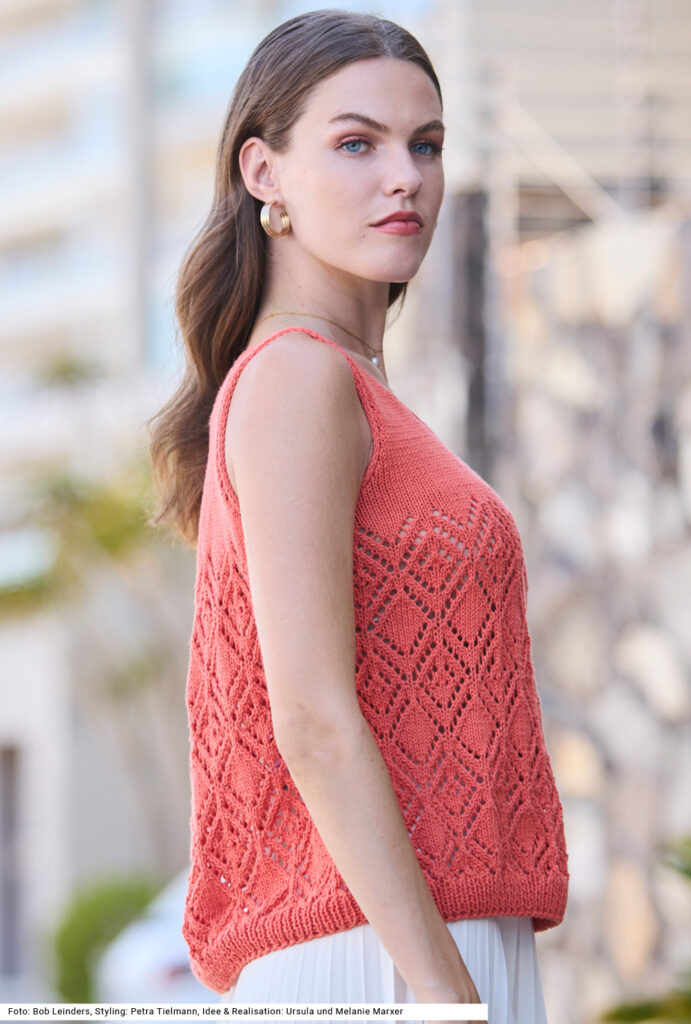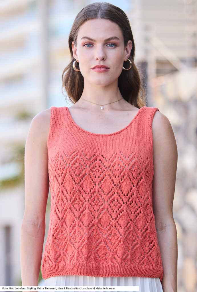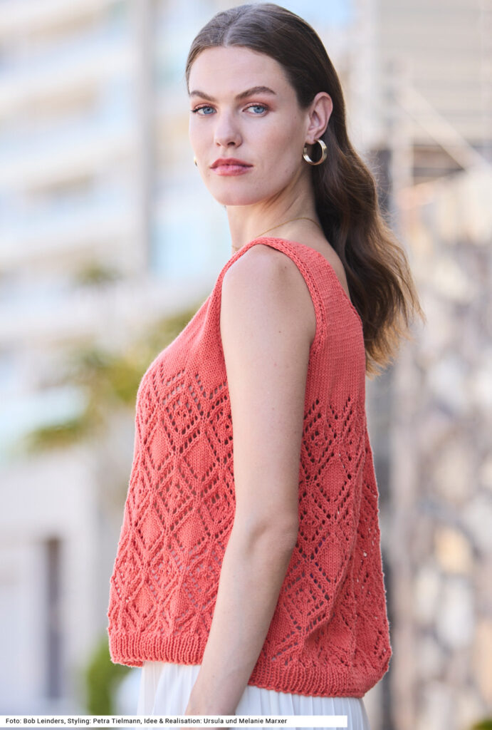 Dieses Duo aus einem ärmellosen Top bezaubert mit luftigem Ajourmuster und einer gehäkelten Tasche. Im Gegensatz zum unifarbenen Pulli ist die Tasche in drei Farben gearbeitet. Damit sie mehr Stabilität erhält, wird mit doppeltem Faden gehäkelt. Die breiten Streifen im Filetmuster (Stäbchen und Luftmaschen) sind unterbrochen durch schmalere Streifen aus Stäbchen, die auch den dreifarbigen Henkel bilden. Beide Teile – Top und Tasche – sind aus einem reinen Baumwollgarn. Im oberen Bereich wird das Top glatt rechts gestrickt und der Halsausschnitt mit einem I-Cord umrandet. Eine Anleitung gibts für die Größen 36/38, 40/42 und 46/48.