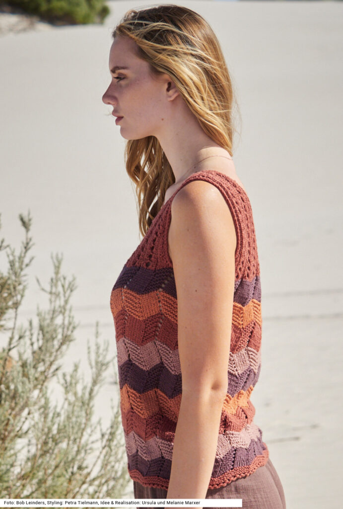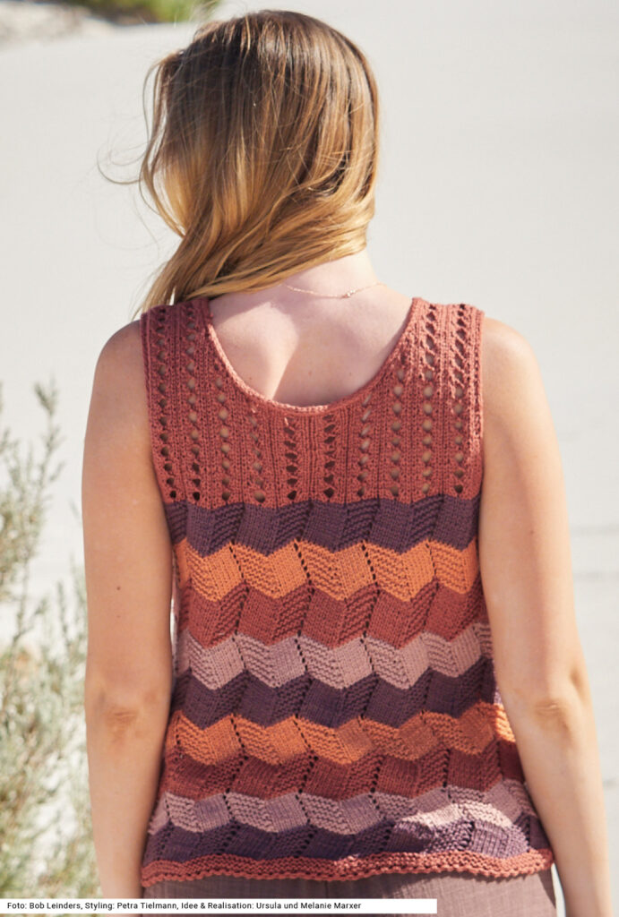 Top und Tasche im Set sehen einfach nobel aus – besonders, wenn in der übrigen Garderobe eine der Farben noch mal aufgegriffen wird. Das bis zu den Armausschnitten rundgestrickte Top sticht mit zwei gegensätzlichen Lochmustern und in vier Farbtönen Aubergine, Rosenholz, Rost und Terracotta, die harmonisch aufeinander abgestimmt sind, ins Auge. Dazu gibt es eine passende Tasche im gleichen zackigen Muster, die für mehr Stabilität zweifädig gearbeitet wird. Sowohl Tasche als auch Top haben einen I-Cord-Rand. Für das Set haben wir ein Baumwolle-Viskose-Garn genommen. Die Anleitung steht für die Größen 36/38, 40/42 sowie 44/46 und die Tasche mit 35 x 25,5 cm zum Download bereit.