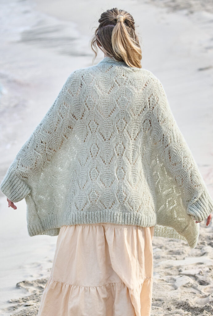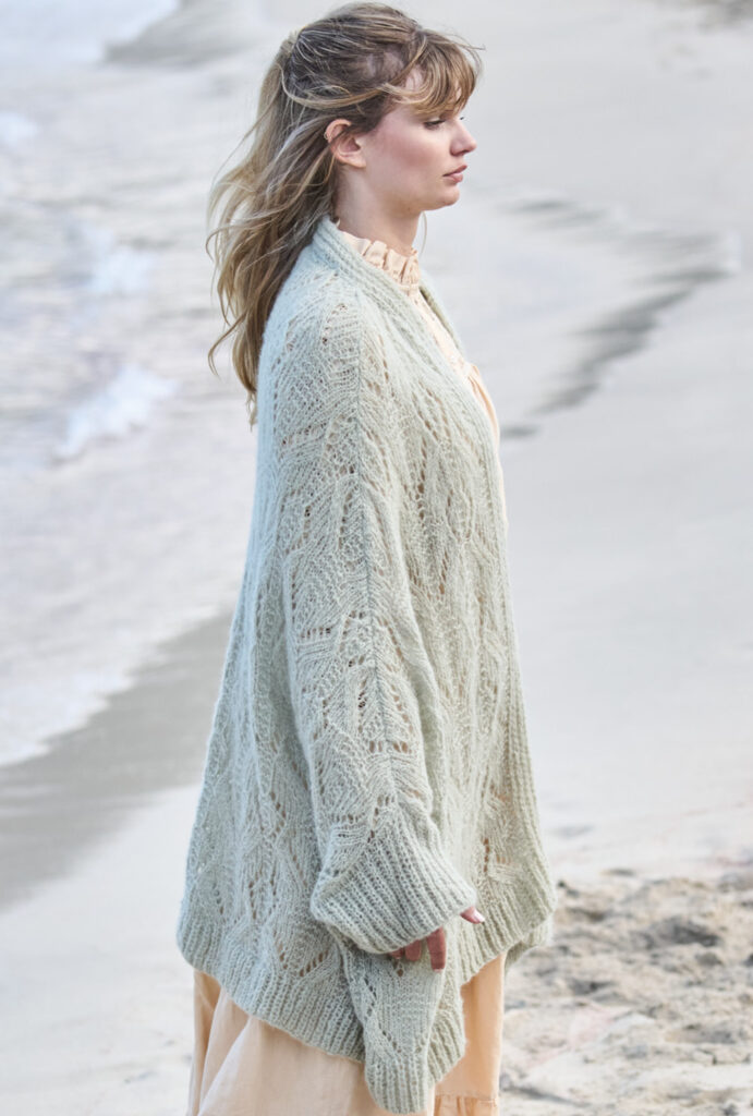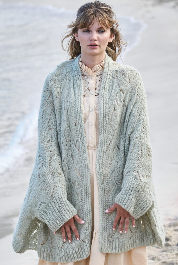 Wenn man für ein Garn aus weichem Mohair, angereichert mit Seide, Yak und Schurwolle entscheidet, möchte man sich einhüllen ohne sich einzuengen und einen Tragekomfort genießen, der sich weich um die Körperkonturen schmiegt. Voilà, all dies bietet die lindgrüne Jacke, für die wir ein ausdrucksvolles Ajourmuster zweifädig verstrickt und als Schnitt eine verschlusslose Ponchoform mit abgerundeten Schultern gewählt haben. Die schmalen Vorderteilblenden sind mitangestrickt, zum Schluss musst du nur noch die Maschen für die geraden Kurzärmel auffassen und im Rippenmuster anfertigen.